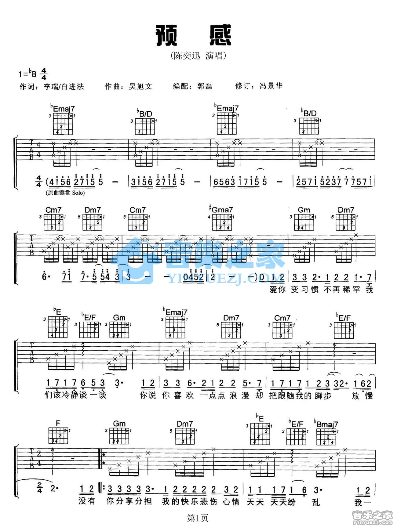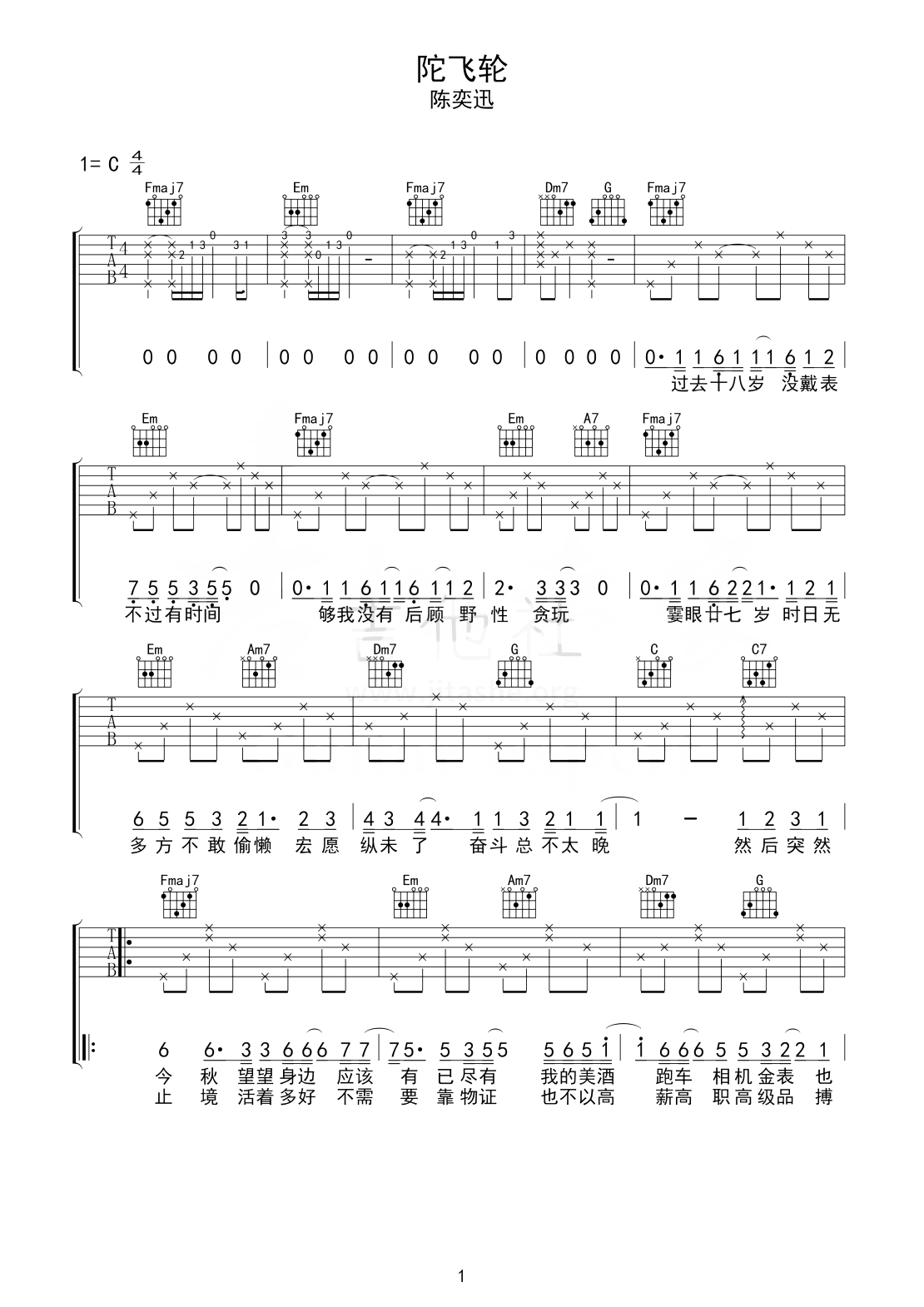 陈奕迅《陀飞轮》吉他谱,吉他专家编配出品,共有4张高清图谱。...