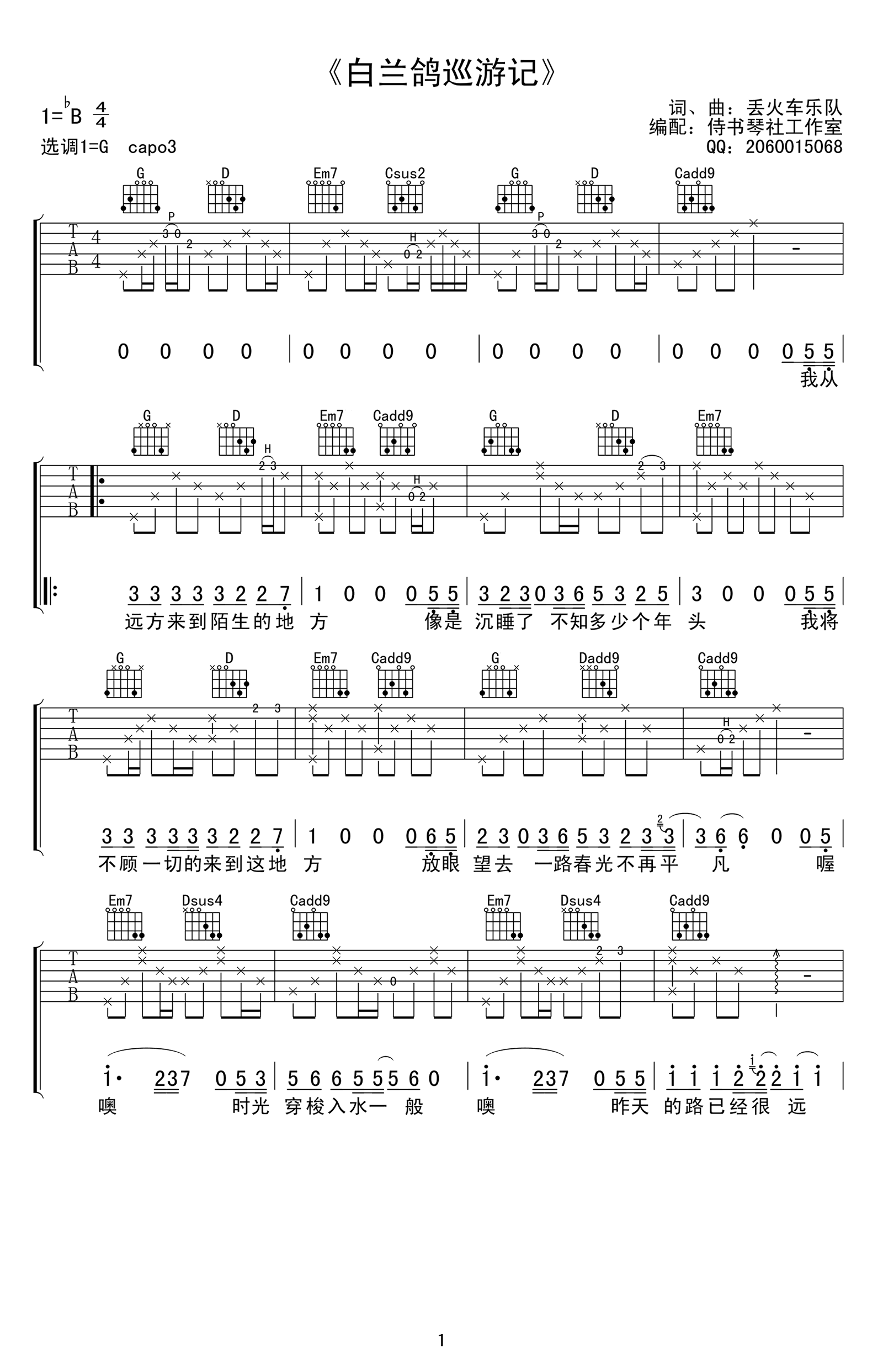 丢火车乐队《白兰鸽巡游记》吉他谱,原调bB,选调G,capo夹三品。独特而有质感的嗓音,伴随着悠扬的旋律向我们娓娓道来一个关于追寻的故事。静静地聆听,或许你可以从这首歌里看到自己的影子。...