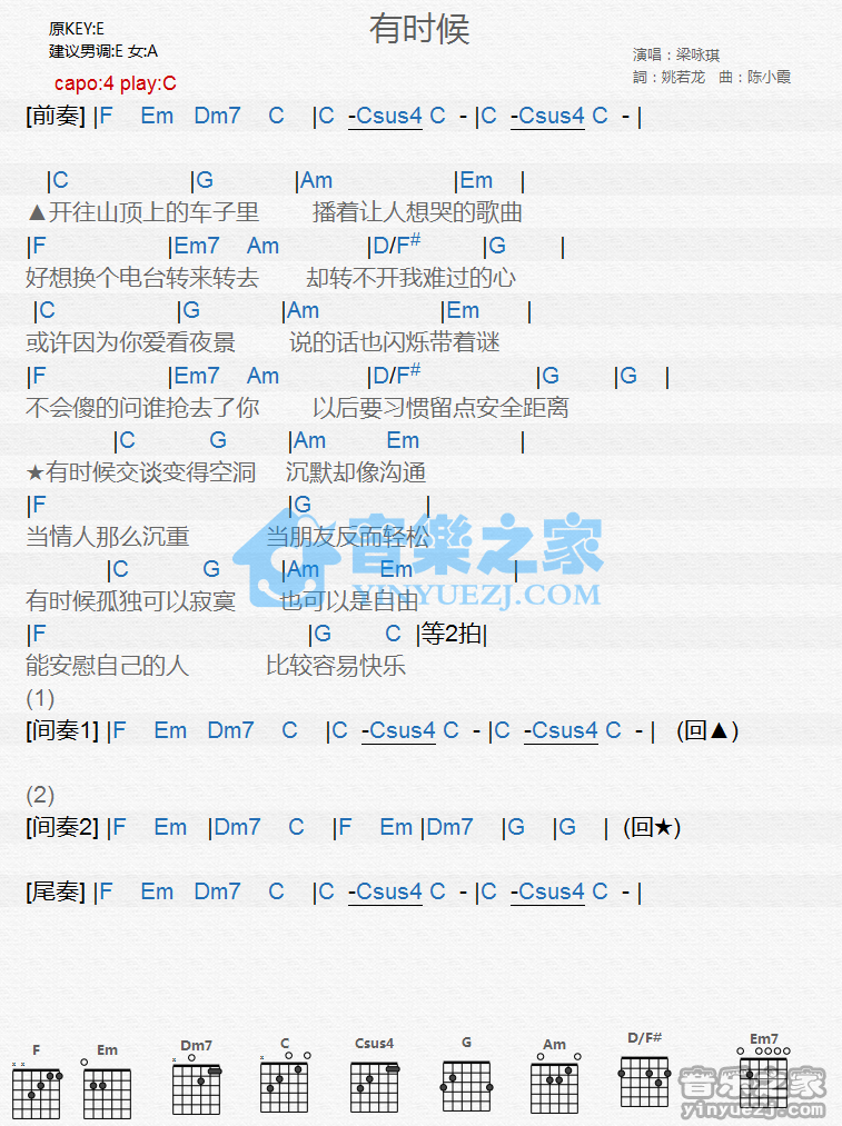 C调版梁咏琪《有时候》吉他和弦弹唱谱...