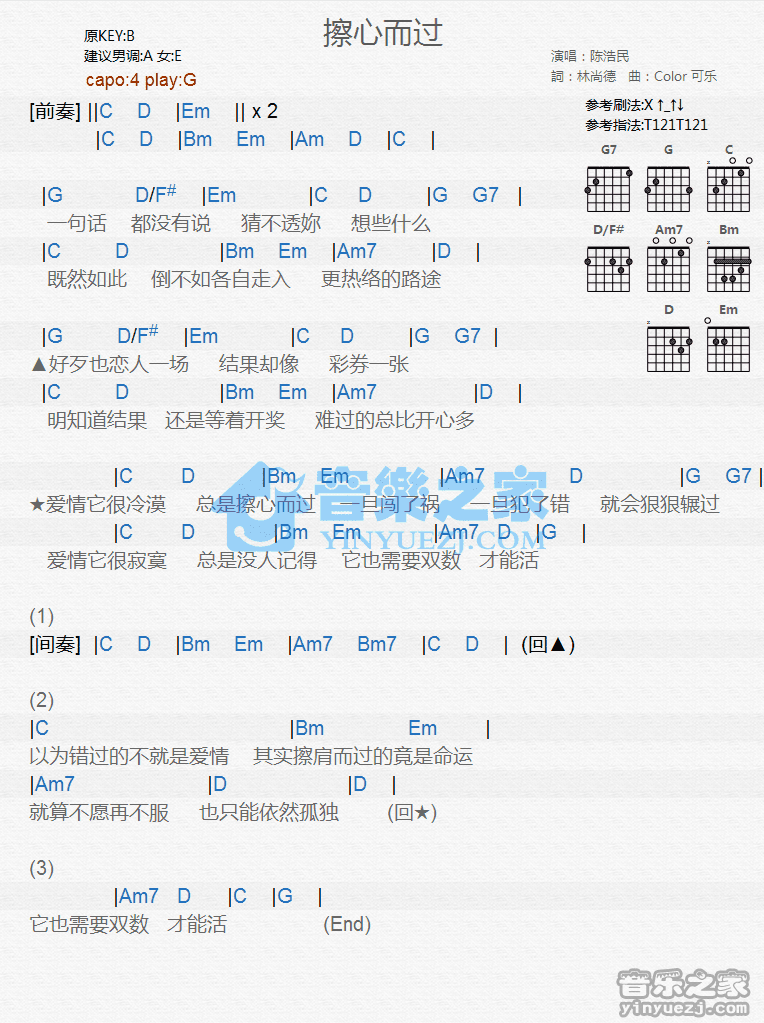 G调版陈浩民《擦心而过》吉他和弦弹唱谱...