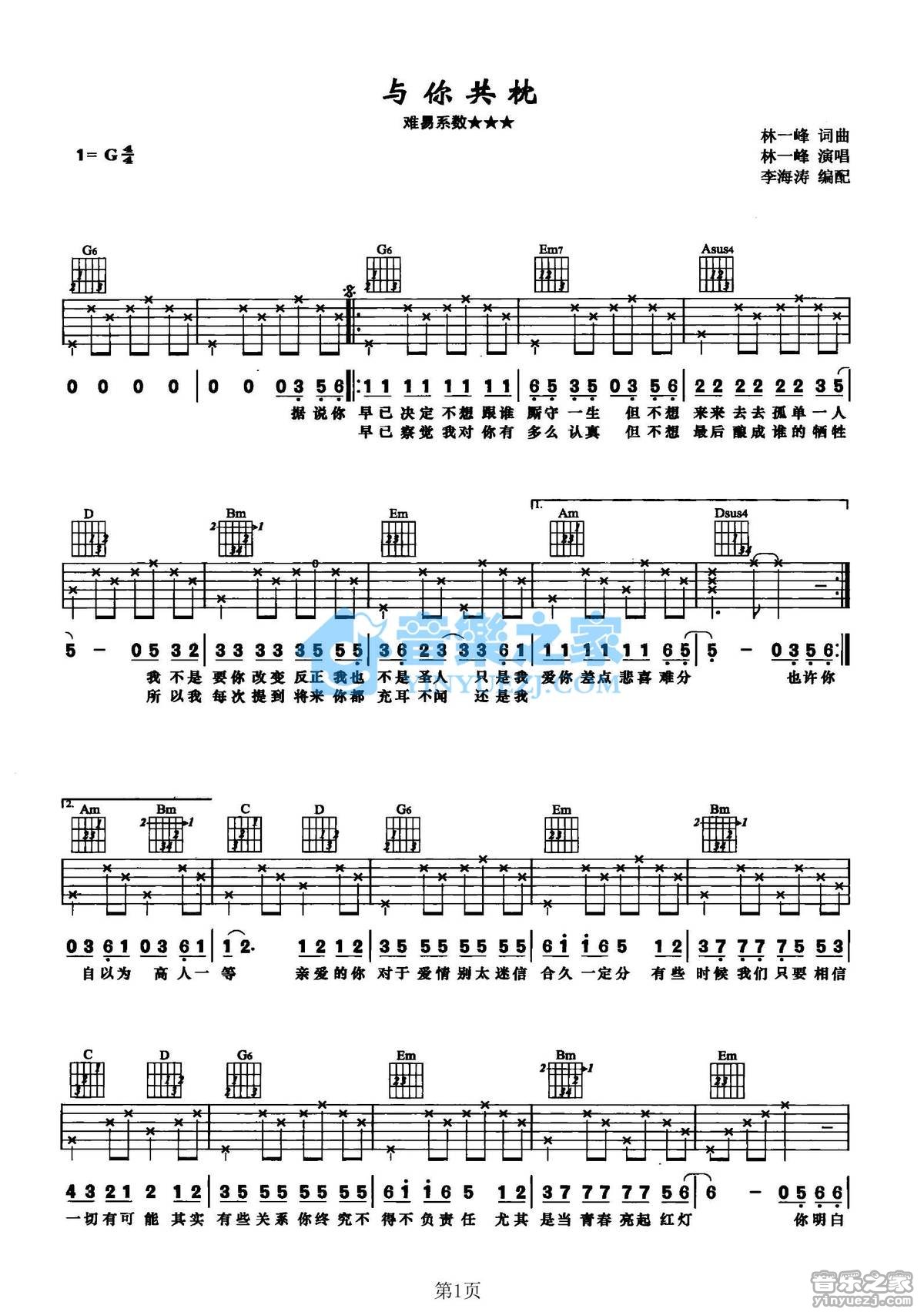 G调版林一峰《与你共枕》吉他弹唱六线谱...