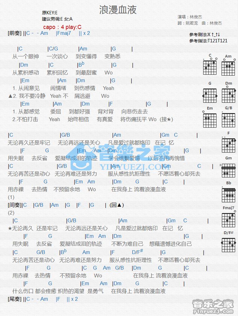 C调版林俊杰《浪漫血液》吉他和弦弹唱谱...