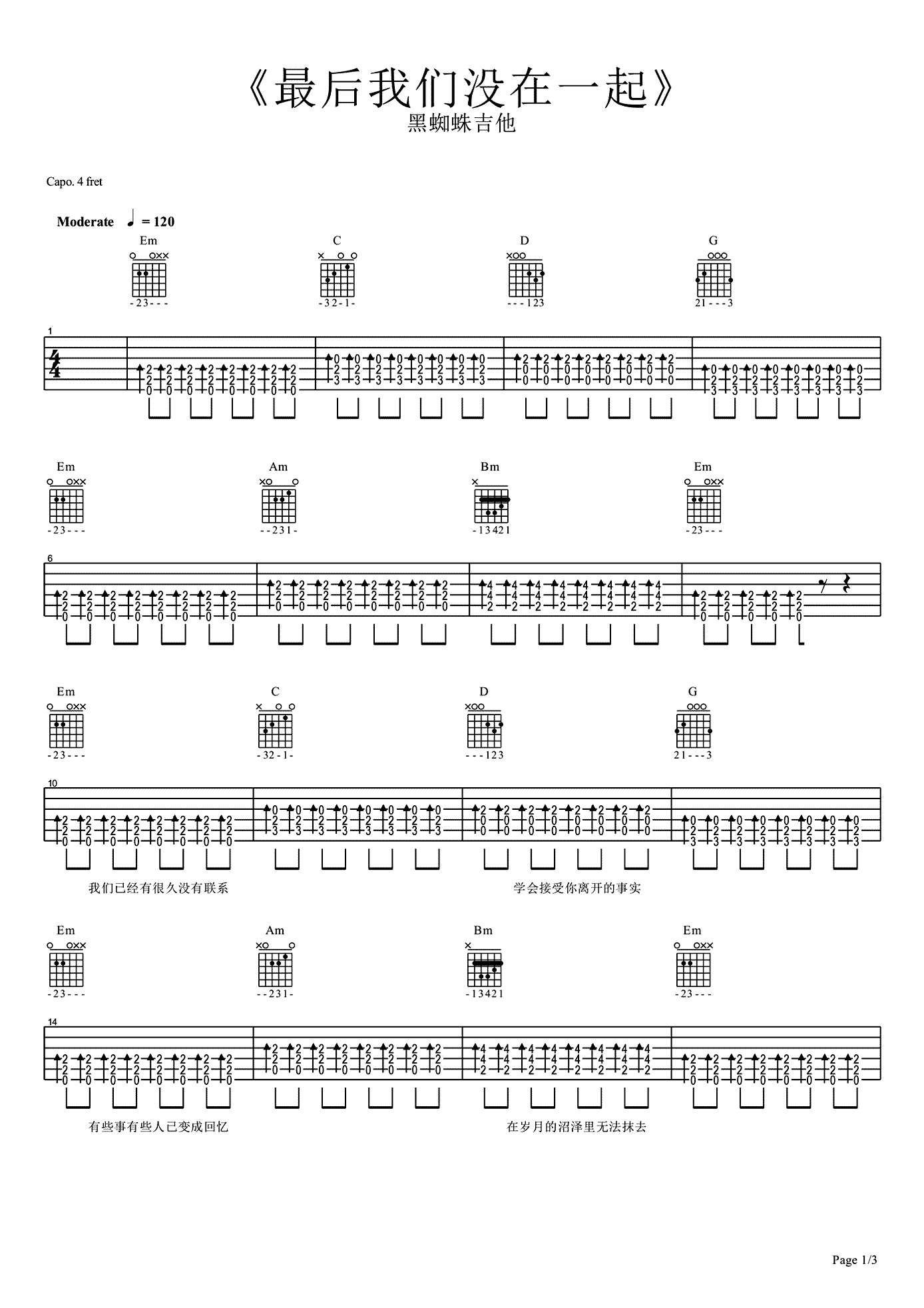 白小白《最后我们没在一起》吉他谱,选用G调指法,Capo夹第四品。随谱附上歌曲的弹唱示范和教学视频,喜欢这首歌曲的琴友们跟随老师调演示和讲解练习。一首《最后我们没在一起》听哭多少有缘无份的人,每个人都会经历一段刻骨铭心的爱情,爱让人受伤,也让人成熟,一个人还是要继续一个人的生活。...