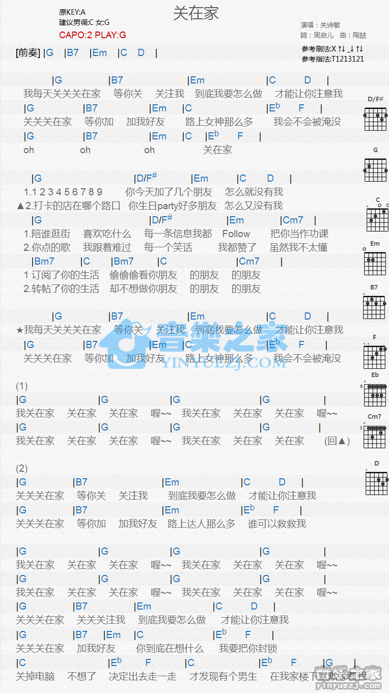 G调版关诗敏《关在家》吉他和弦弹唱谱...