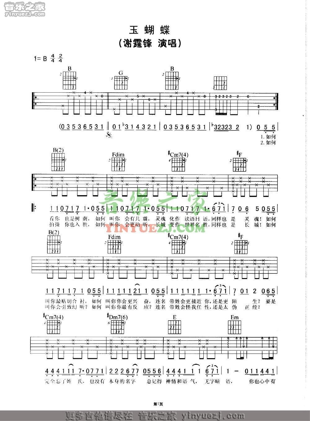 谢霆锋《玉蝴蝶》吉他谱,YYZJ编配出品,共有3张高清图谱。...