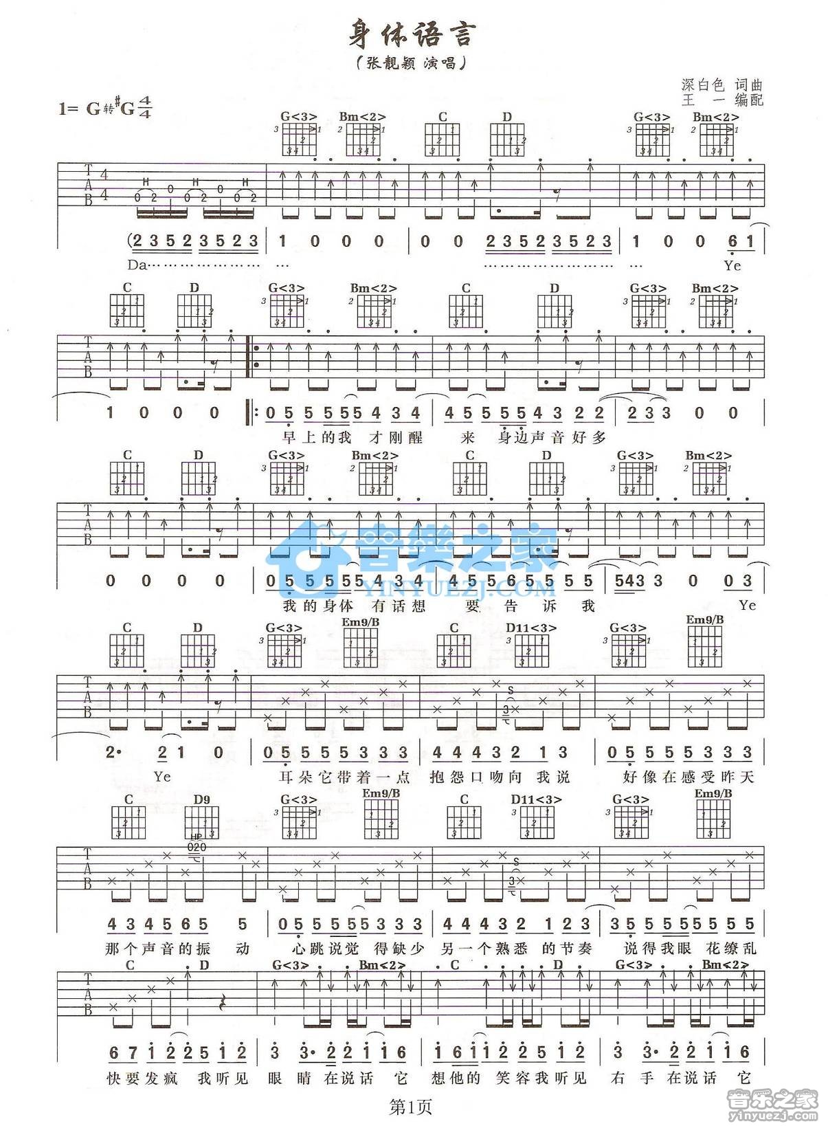 G转#G调版张靓颖《身体语言》吉他弹唱六线谱...