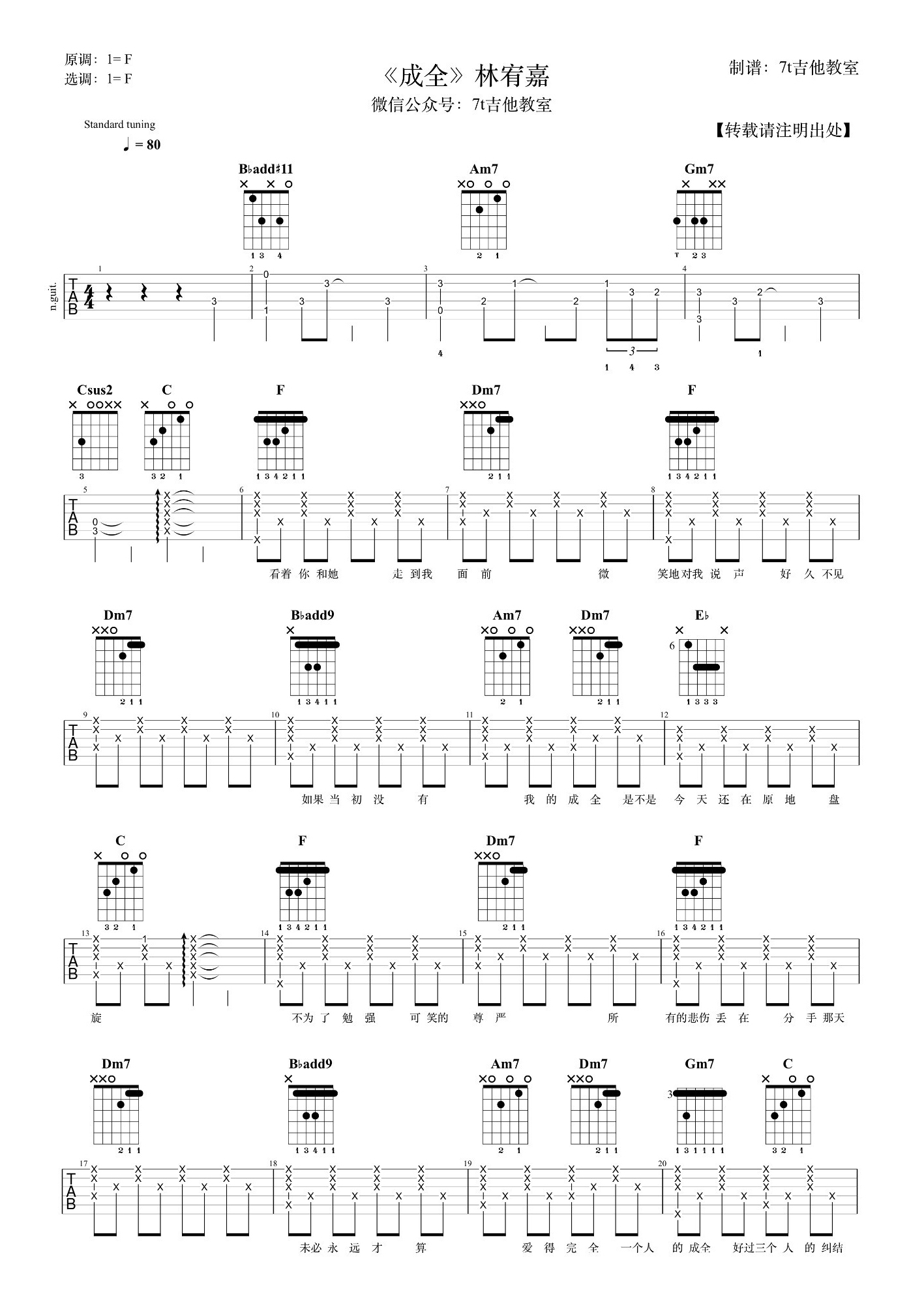 林宥嘉《成全》,是给你的祝福,也是给自己的解脱。爱过那么多年,今后不再见,你有你的碧海蓝天,我有我的不再怀念。其实,成全一个爱你的人,也是在成全自己的爱,这种微妙的羁绊,也是一世温暖。根据林宥嘉演唱的版本编配吉他谱,F调原调指法版(谱子里有个Eb和弦,难度比较大,觉得麻烦的话可以...