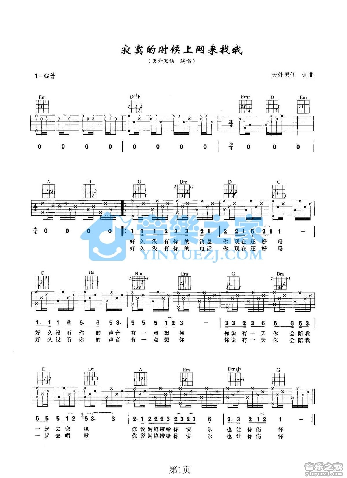 吉他天外黑仙《寂寞的时候上网来找我》吉他谱 - 非常多人都在弹的版本