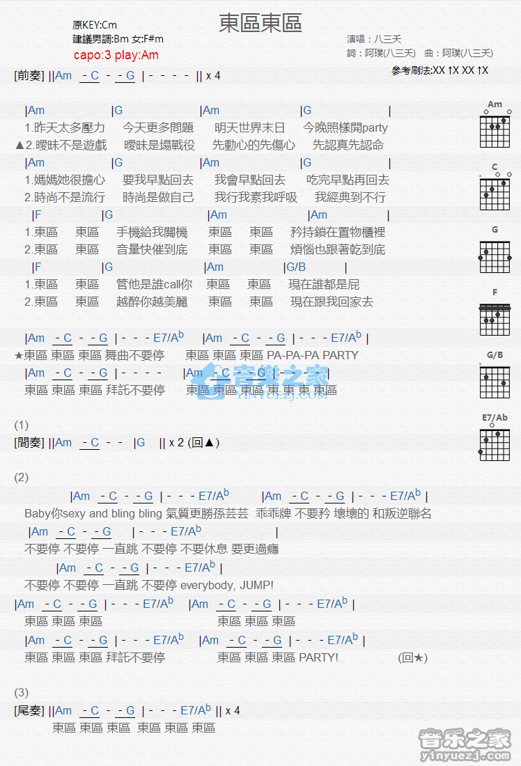 Am调版八三夭《东区西区》吉他和弦弹唱谱...