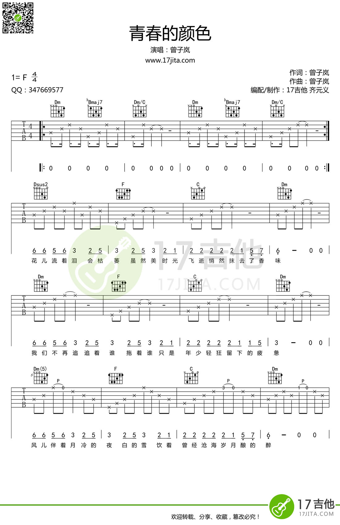 曾子岚演唱,青春的颜色吉他谱,无意在中央电视台12频道的普法栏目剧《我的青春》听到的主题曲,当时一听到就有一种ding的感觉!觉得词曲都写的很不错,曾子岚自己填词作曲的一首原创歌曲,唱出了青春的种种,感觉好像自己也经历过这种时候;青春的颜色吉他六线谱,歌曲清新舒缓适合吉他弹唱。...
