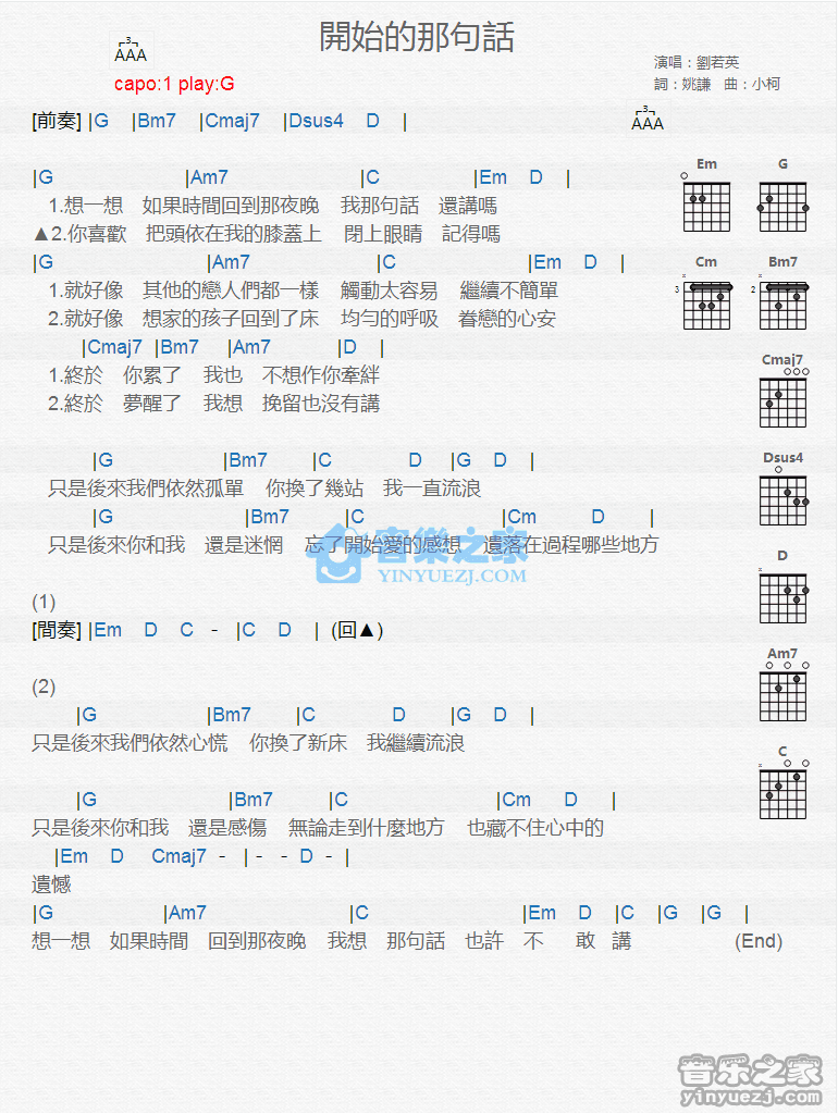 G调版刘若英《开始的那句话》吉他和弦弹唱谱...
