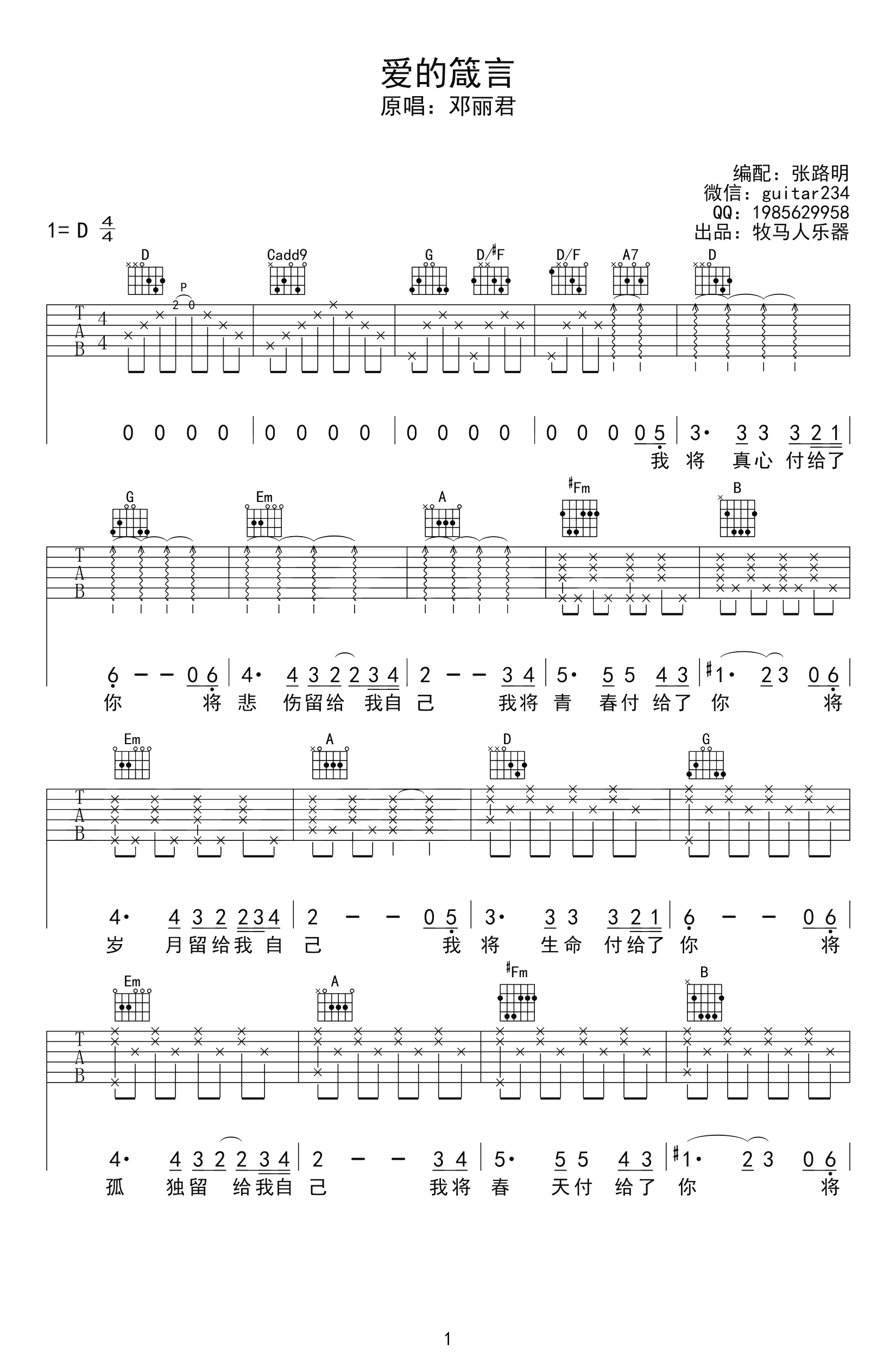 吉他邓丽君/罗大佑《爱的箴言》吉他谱 - 很多人都在弹的版本