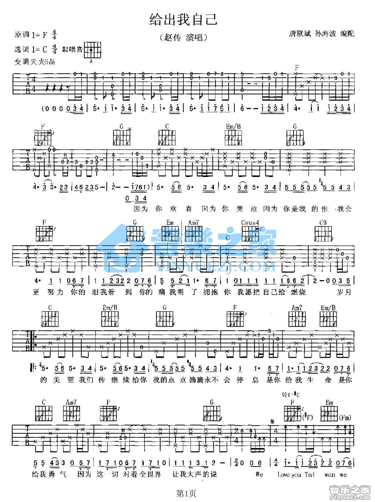 C调版赵传《给出我自己》吉他弹唱六线谱...