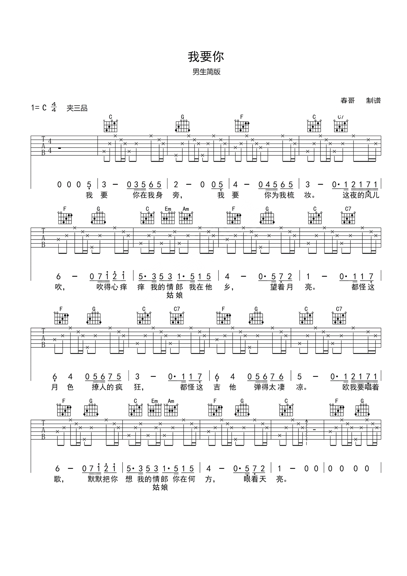 任素汐《我要你》吉他谱,C调夹三品,男生简单版。电影《驴得水》主题曲。每次这个旋律响起,就会想起张一曼电影里唱这首歌的样子,小颤音里透着万众风情,却又始终带着一股纯真的质朴。...