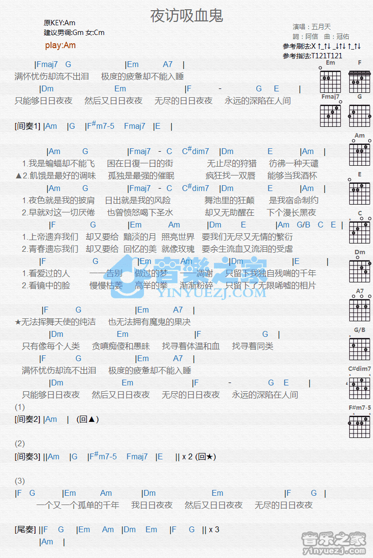 Am调版五月天《夜访吸血鬼》吉他和弦弹唱谱...