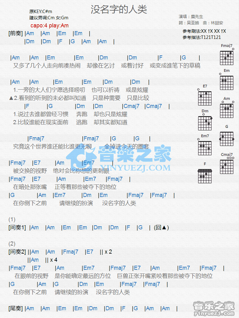 Am调版麋先生《没名字的人类》吉他和弦弹唱谱...