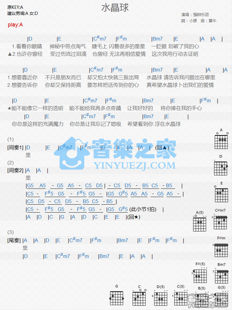 A调版《水晶球》吉他和弦弹唱谱...