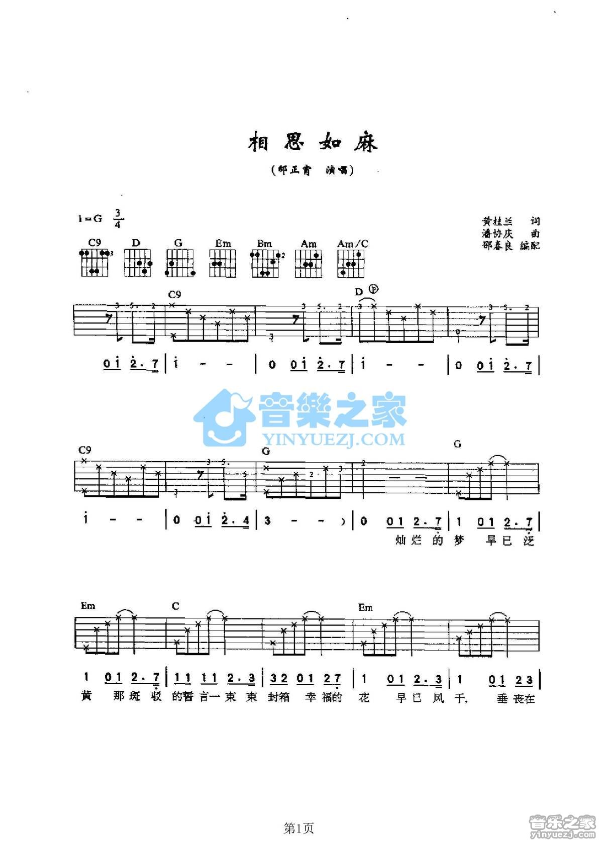 G调版邰正宵《相思如麻》吉他弹唱六线谱...