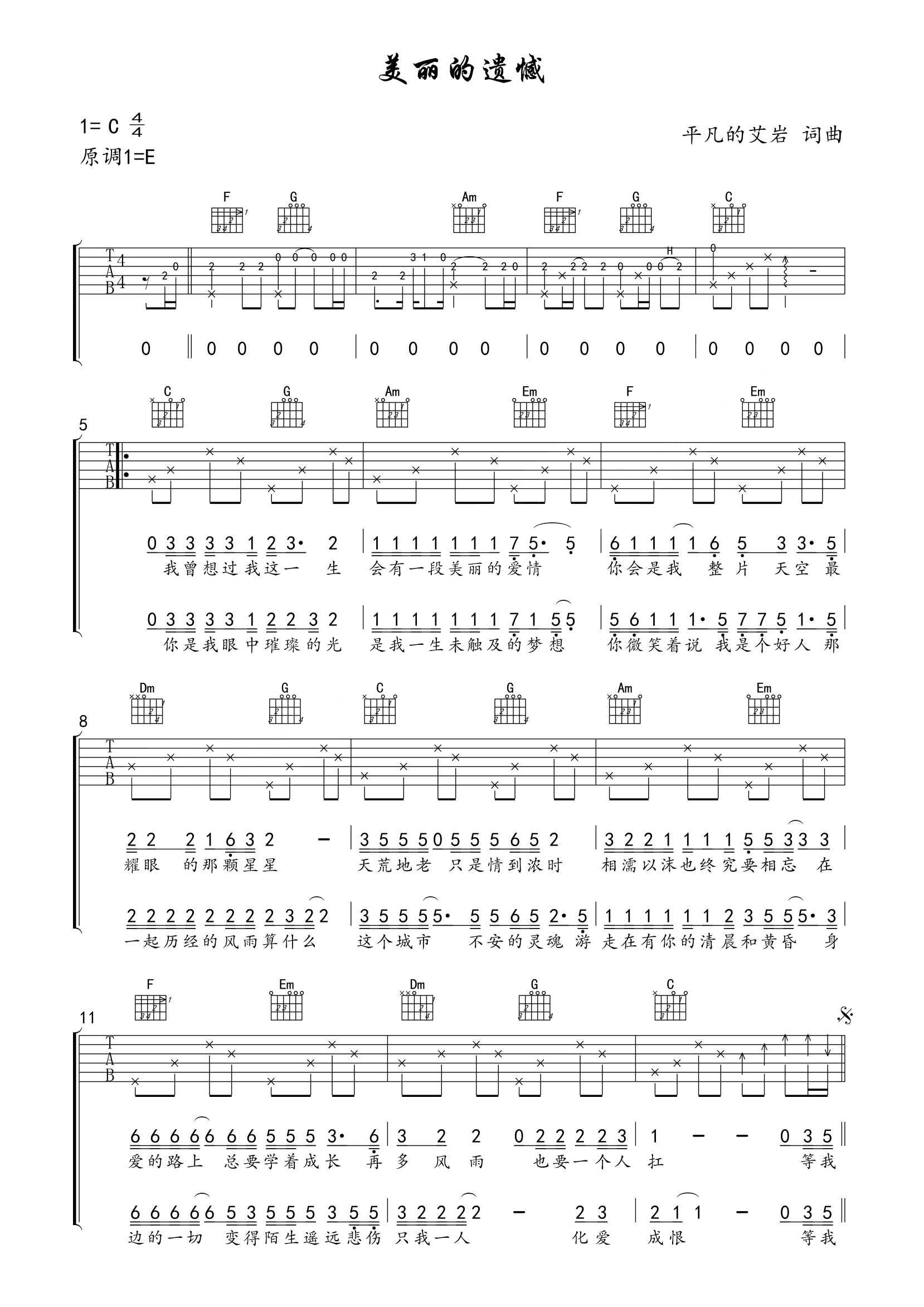 吉他 平凡的艾岩《美丽的遗憾》吉他谱 - 免费版