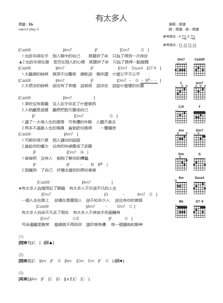 C调版《有太多人》吉他和弦弹唱谱...