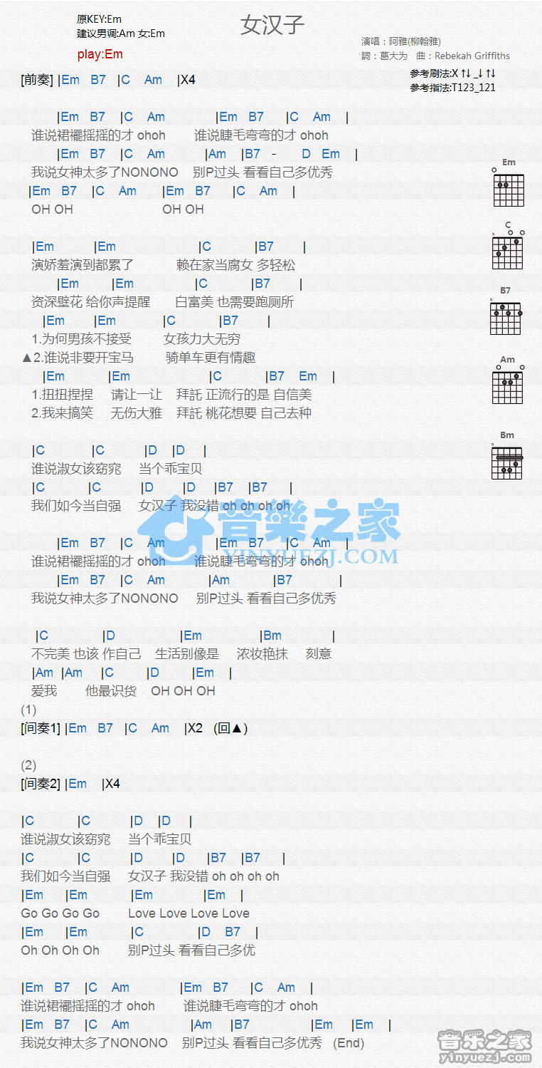 Em调版阿雅《女汉子》吉他和弦弹唱谱...