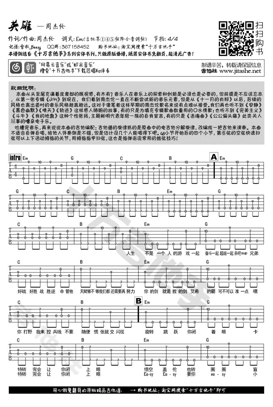 周杰伦英雄吉他谱,LOL英雄联盟主题曲,调式Em(吉他第145弦降全音调弦),四四拍,歌曲编配说明,英雄吉他谱的旋律抓自原曲中的电吉他分解旋律,改编成一把吉他来演奏。本曲适合给人伴奏,不太适合自弹自唱,45小节开始后的四个小节,第6弦的空弦快速扫弦可以上下活动拇指的关节,用拇指的...
