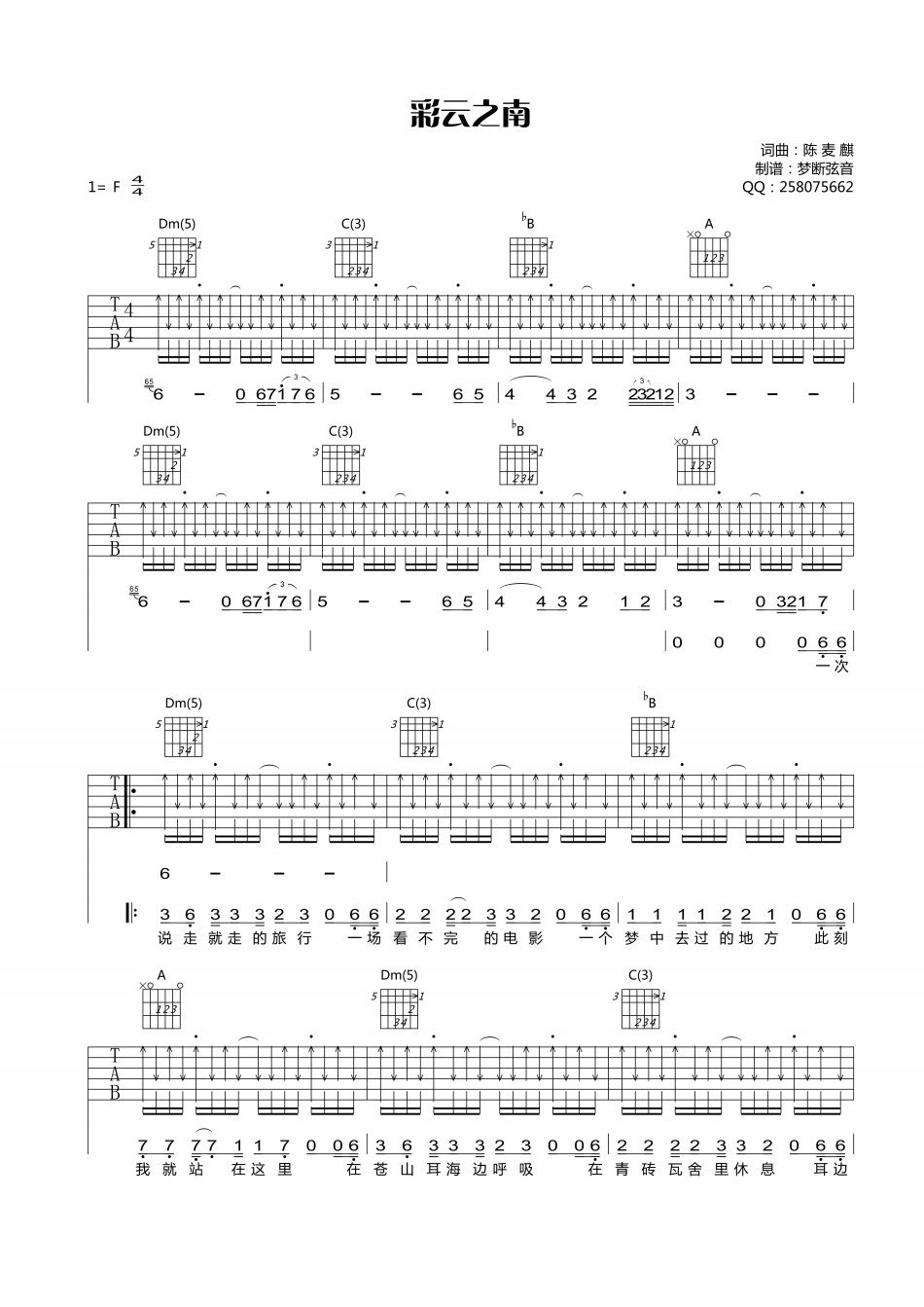 F调版《彩云之南》吉他弹唱六线谱...