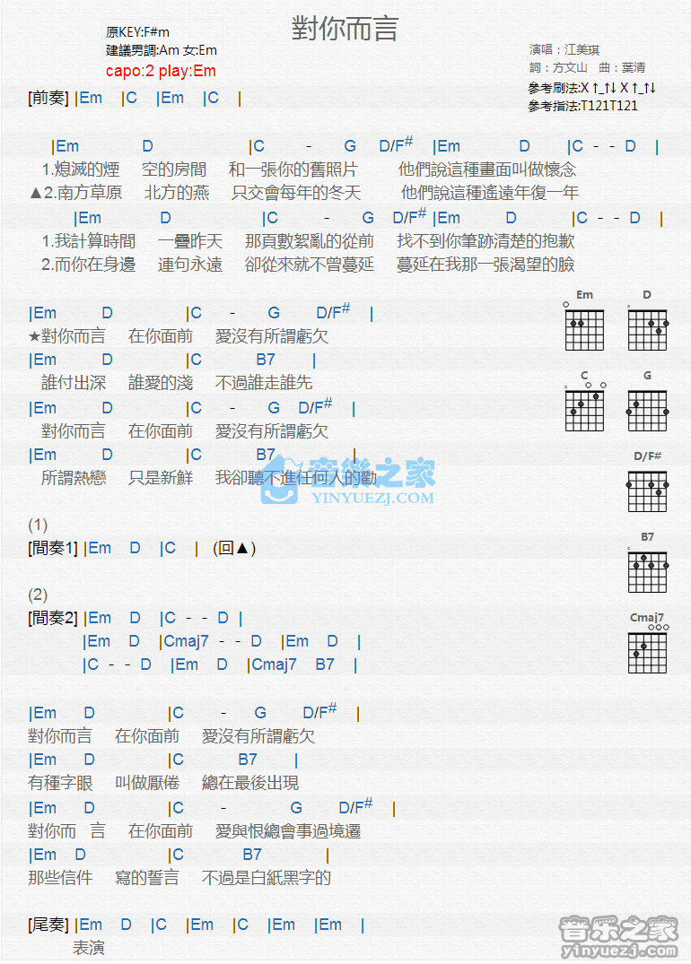Em调版江美琪《对你而言》吉他和弦弹唱谱...