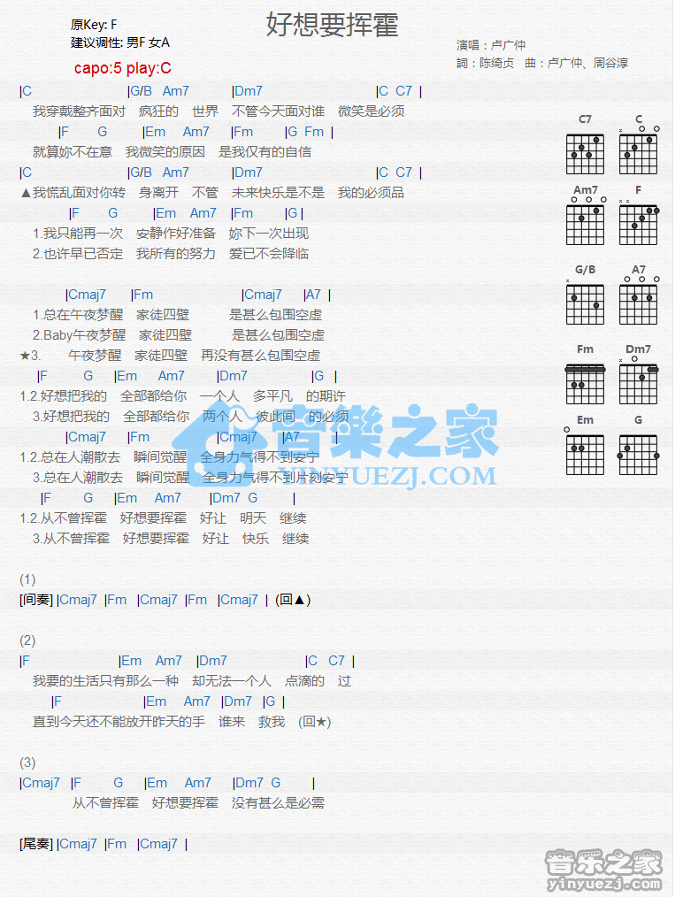 C调版卢广仲《好想要挥霍》吉他和弦弹唱谱...