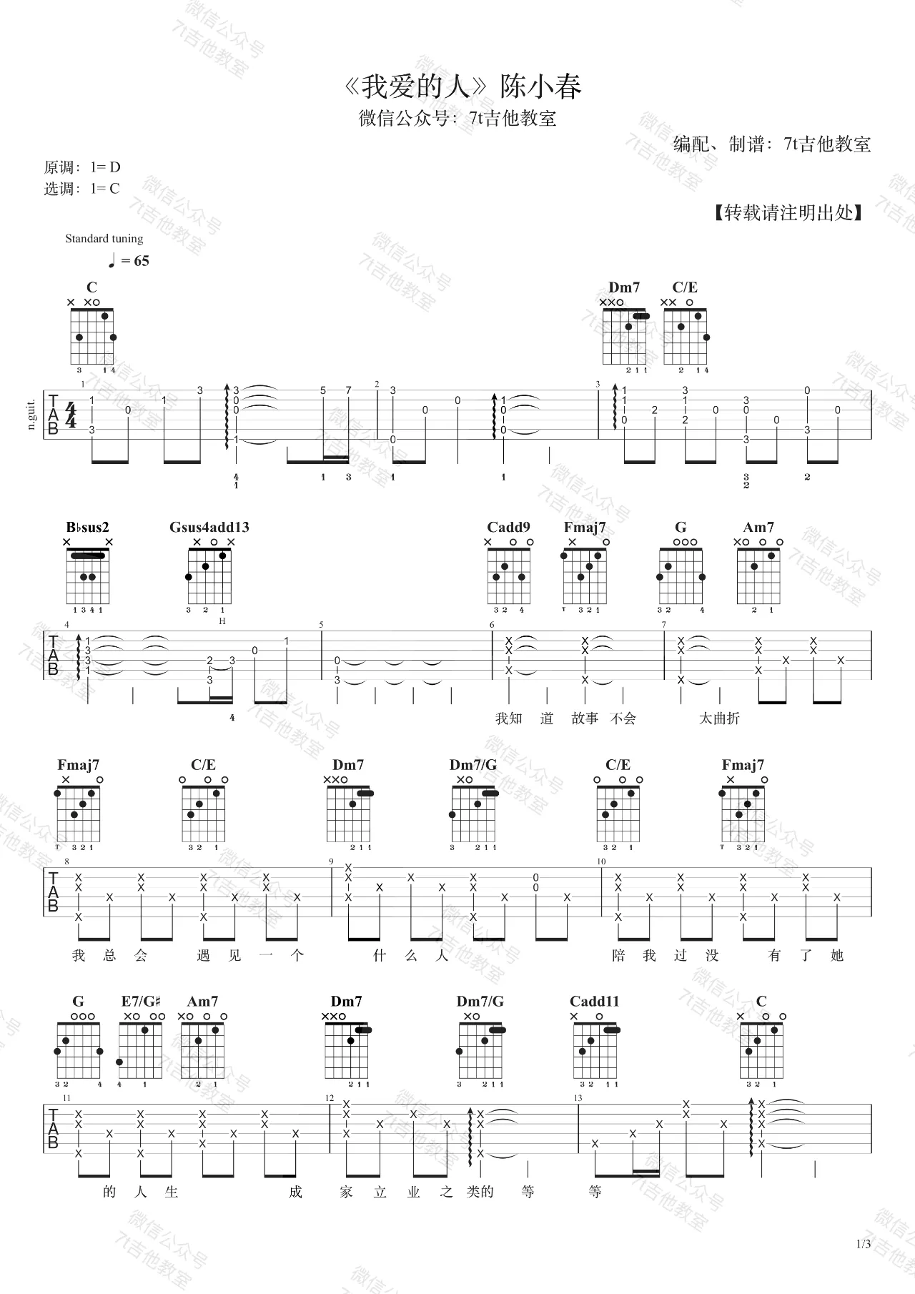 吉他陈麦麒《彩云之南》吉他谱 - 完整版