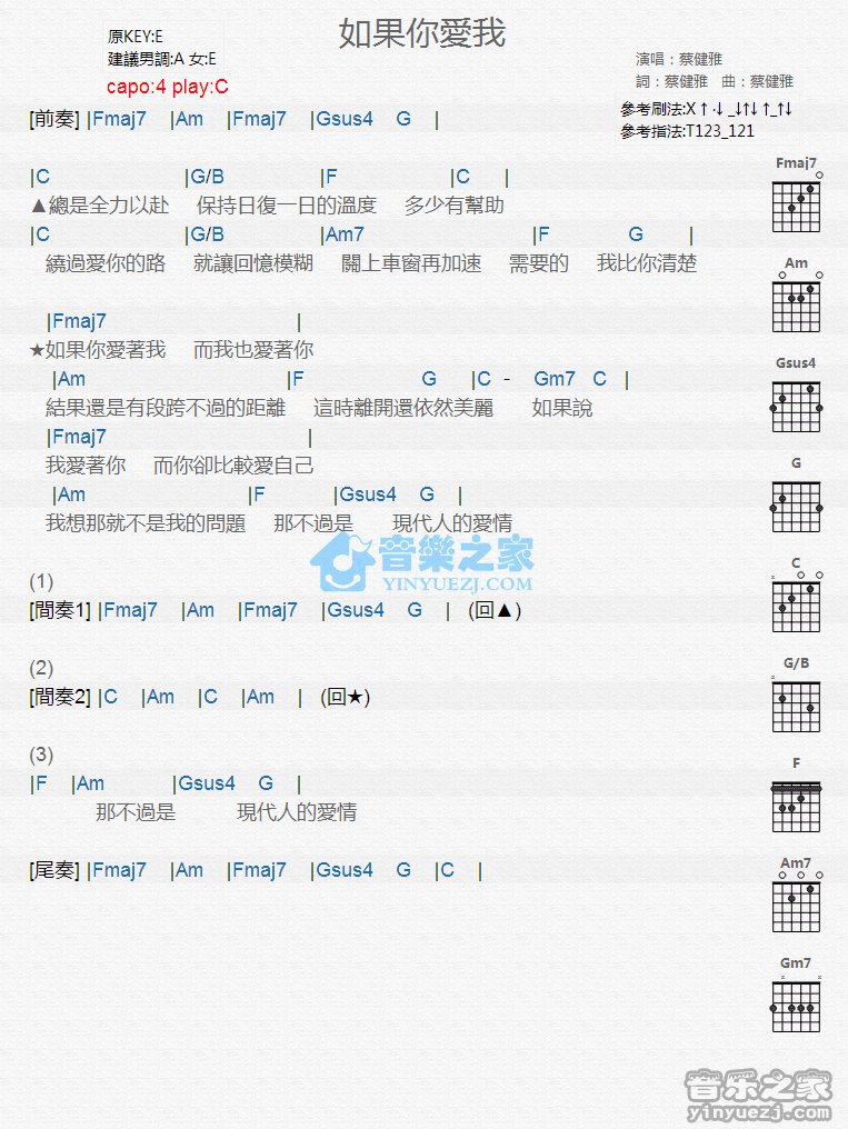 C调版《如果你爱我》吉他和弦弹唱谱...