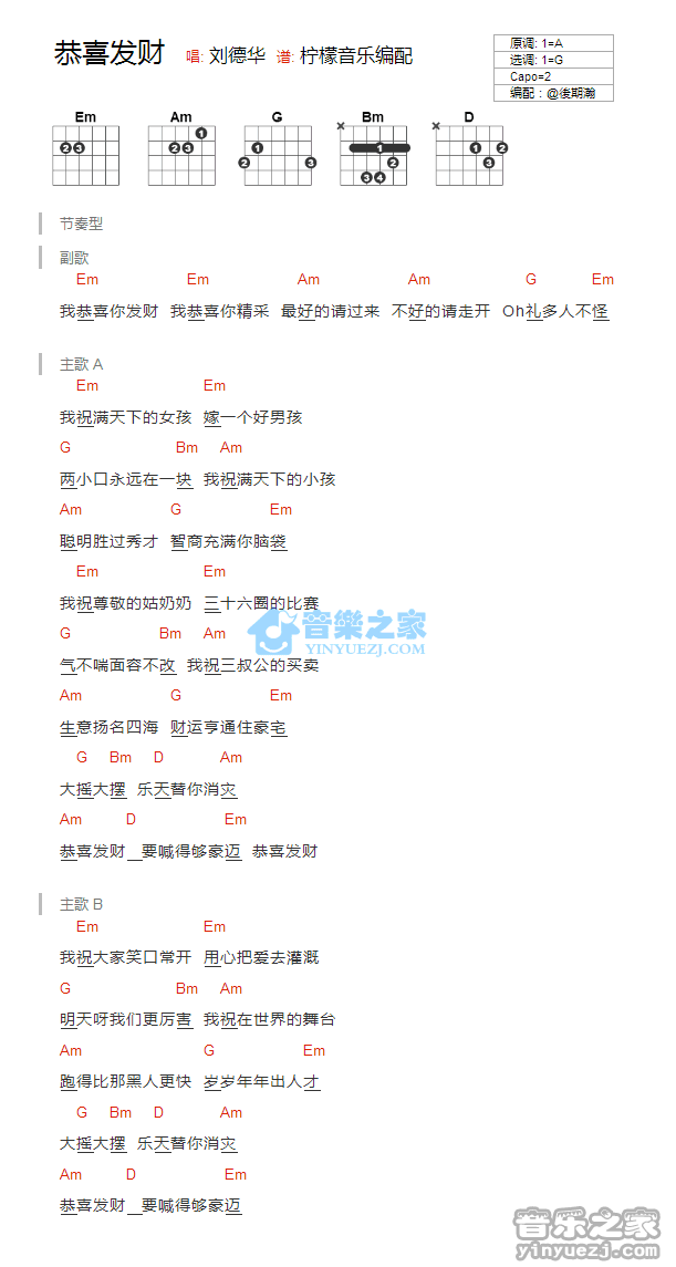 G调版刘德华《恭喜发财》吉他和弦弹唱谱...