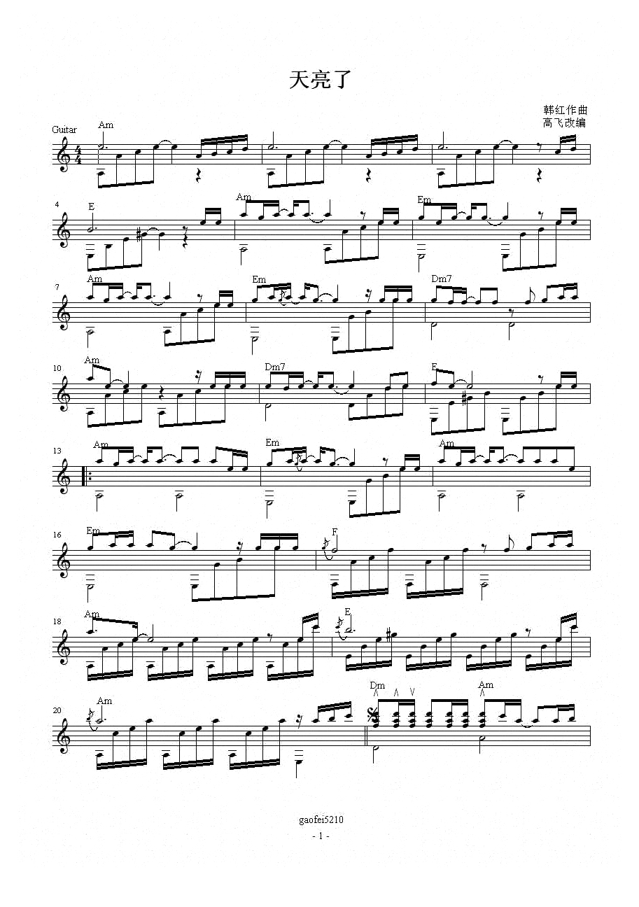 吉他韩红《天亮了》吉他谱 - 很多人都在弹的版本