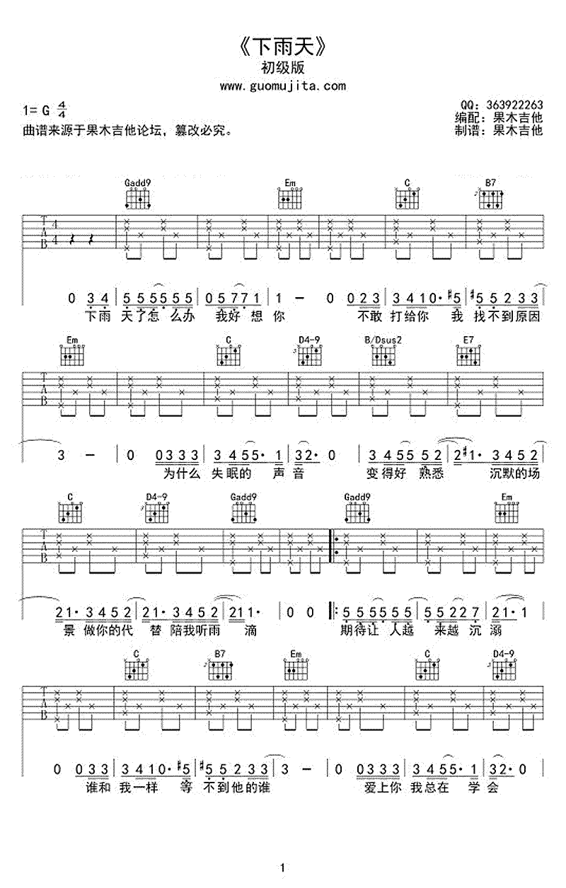 南拳妈妈《下雨天》吉他谱,G调指法,下雨天吉他弹唱谱,初级版,随谱附上吉他弹唱视频演示教学,下雨天,怎样的雨,怎样的夜,怎样的我能让你更想念。恋爱小清新里淡淡的忧伤感觉,怀念那场雨,那雨里的青春。 ...