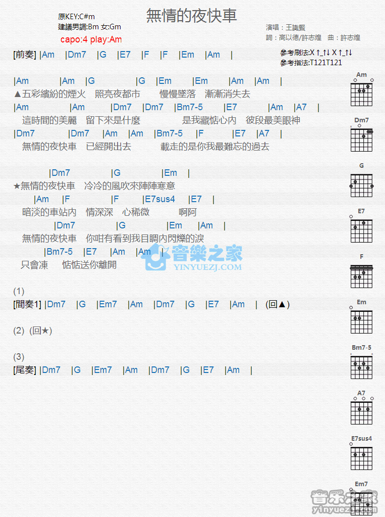 Am调版王识贤《无情的夜快车》吉他和弦弹唱谱...