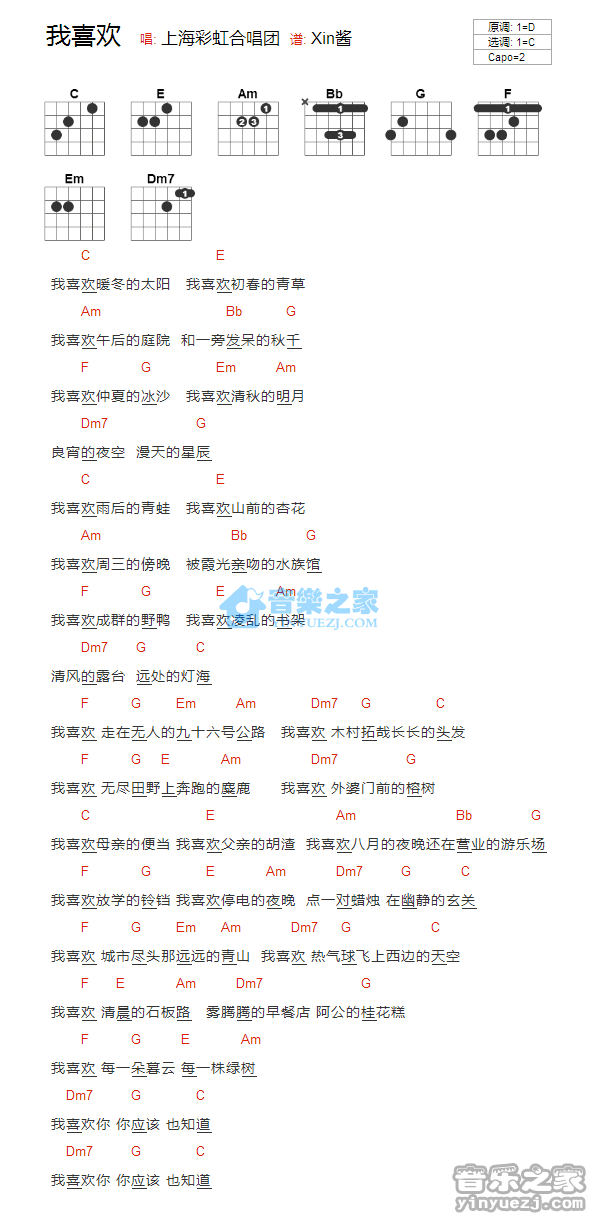 C调版上海彩虹合唱团《我喜欢》吉他和弦弹唱谱...