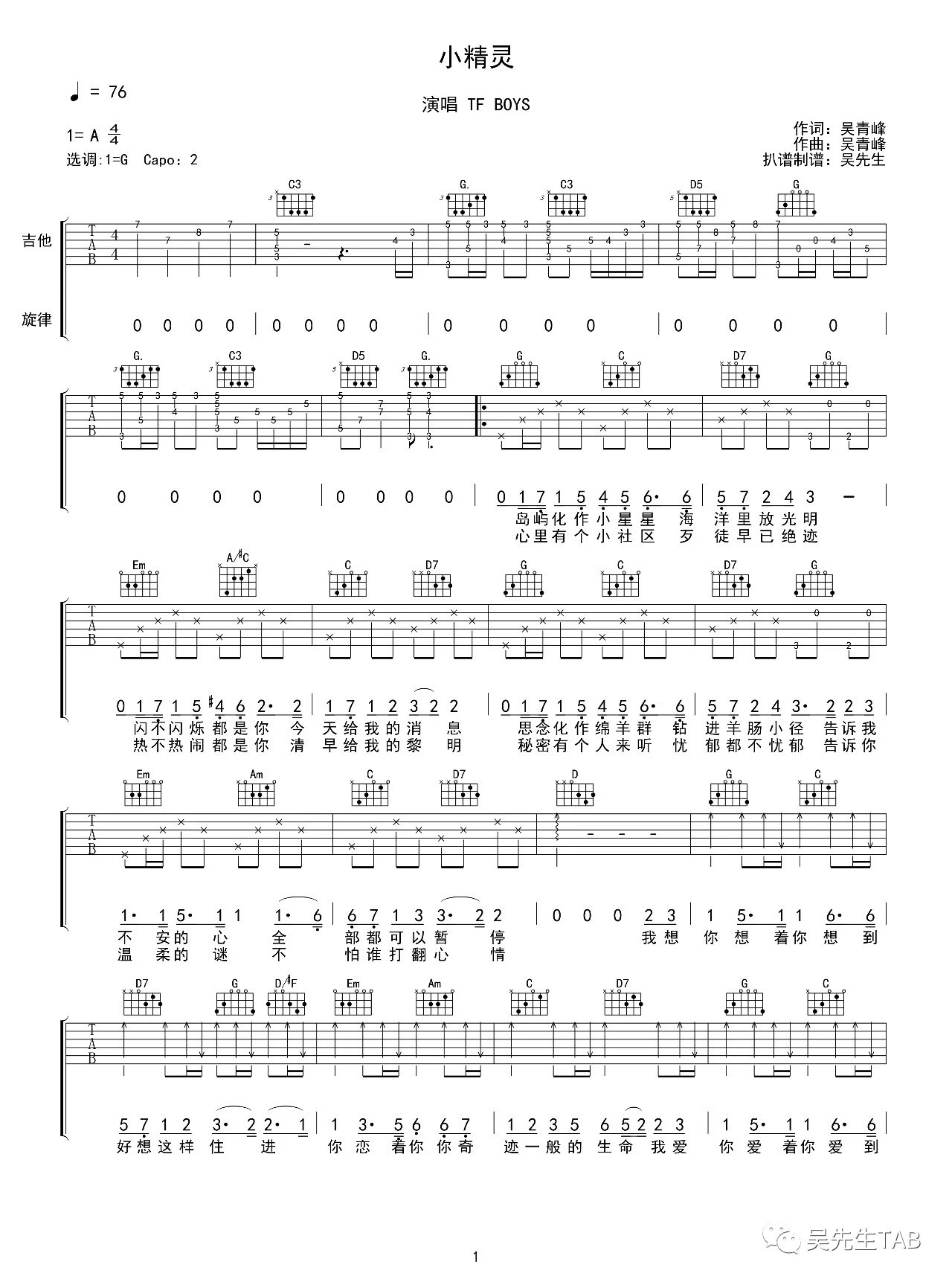 吉他tfboys《小精灵》吉他谱 - 非常多人都在弹的版本