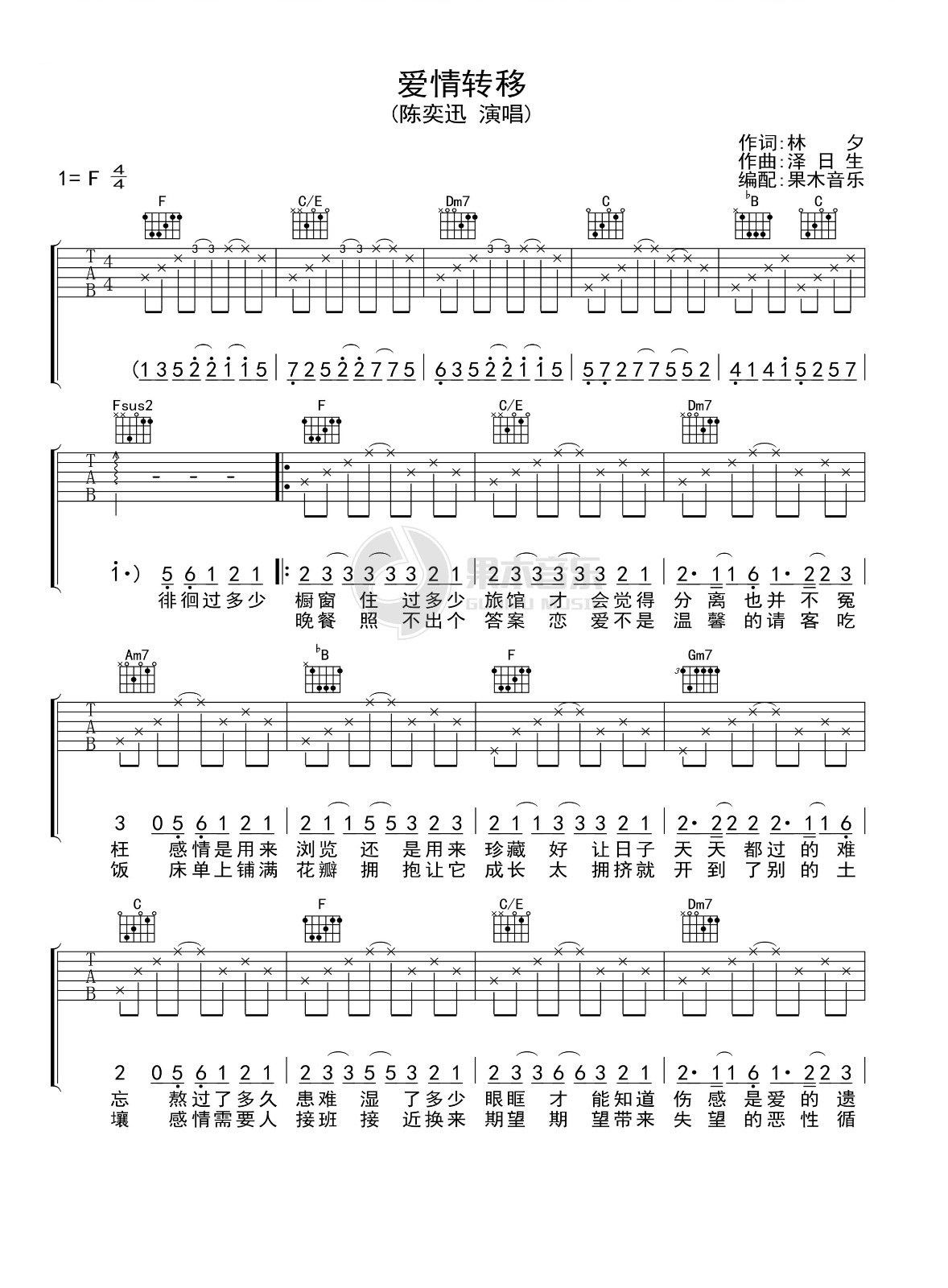 陈奕迅《爱情转移》吉他谱,果木音乐编配出品,共有3张高清图谱。...