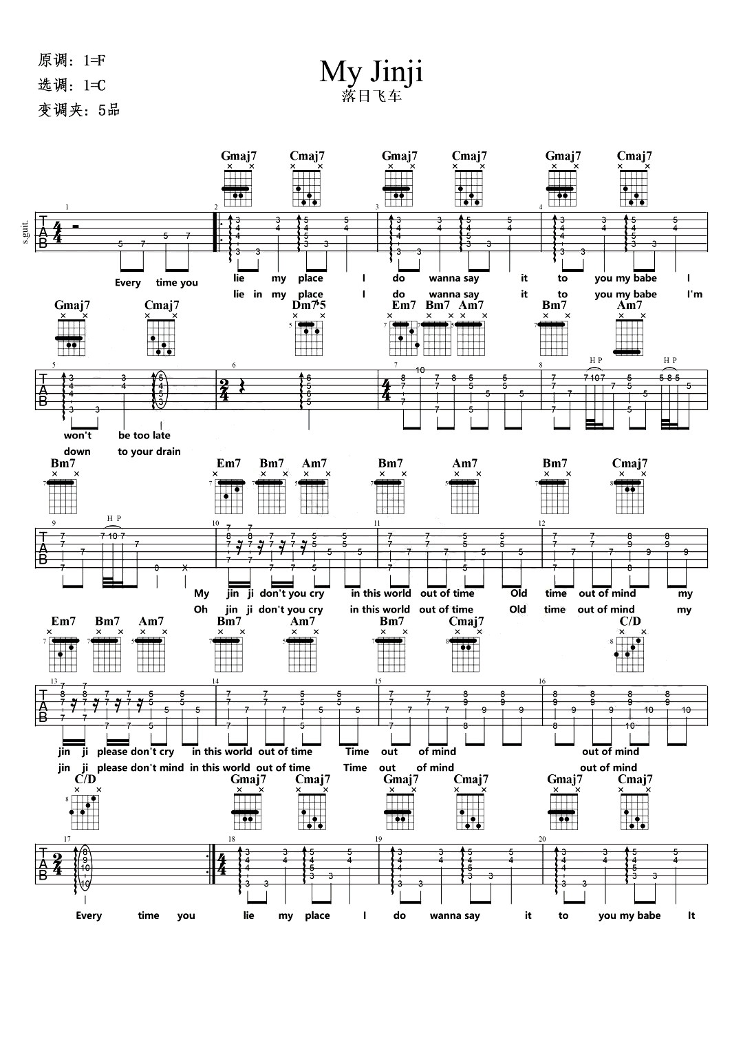 落日飞车《MyJinji》吉他谱,一首摇滚风格的舒缓歌曲,MYJINJI六线谱,原调F,选调C,变调夹夹五品,《Myjinji》是落日飞车乐队专辑《jinjikikko》中演歌曲,带有淡淡的忧愁,似乎在呢喃着心事。歌曲描述穿越时空后jinji在召唤那能逆转时空的恋人,onlyyo...