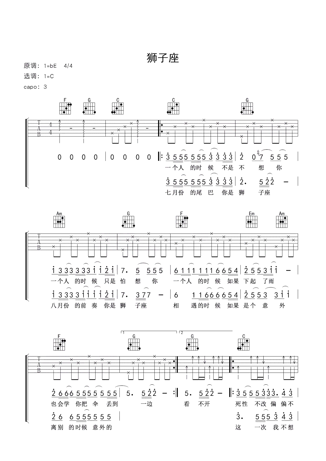 狮子座吉他谱,曾轶可的一首代表歌曲,超级女声时期的成名曲,狮子座六线谱,原调降E,C调指法编配,CAPO夹三品,随谱送上配套吉他弹唱教学视频,本期从零起步基础教学课程,配合歌曲《狮子座》讲解手指扫弦,把节奏画出来内容,琴友们参照老师的示范教学认真练习。...