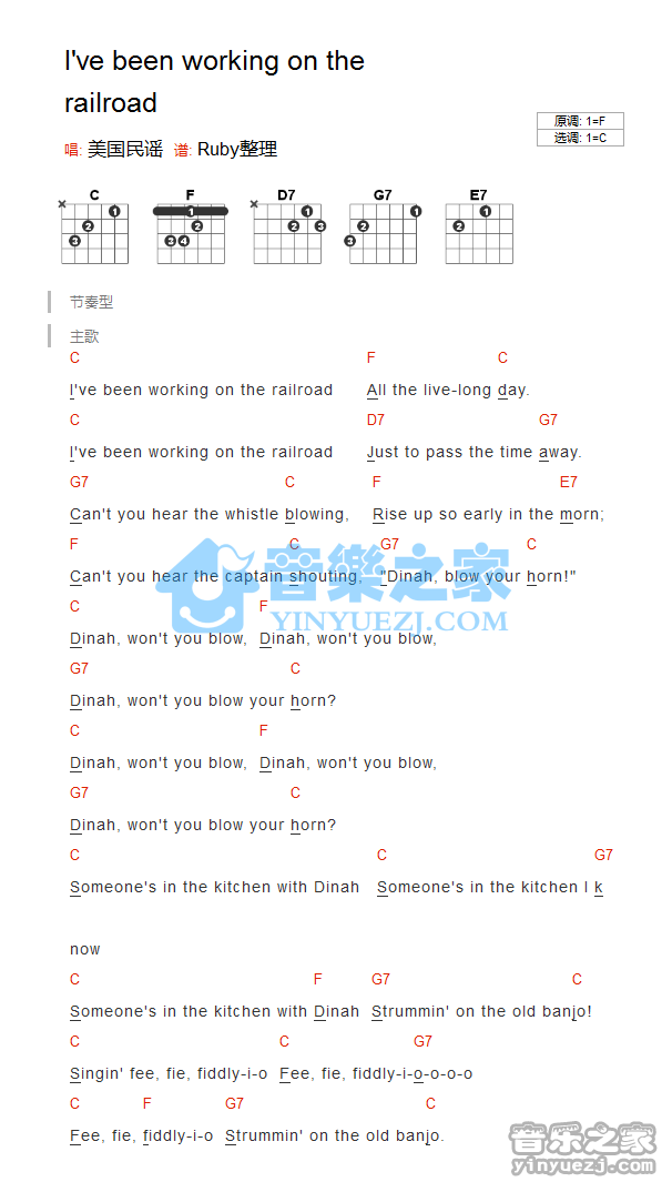 美国民谣《I'vebeenworkingontherailroad》吉他谱,YYZJ编配出品,共有1张高清图谱,免翻页排版设计。...