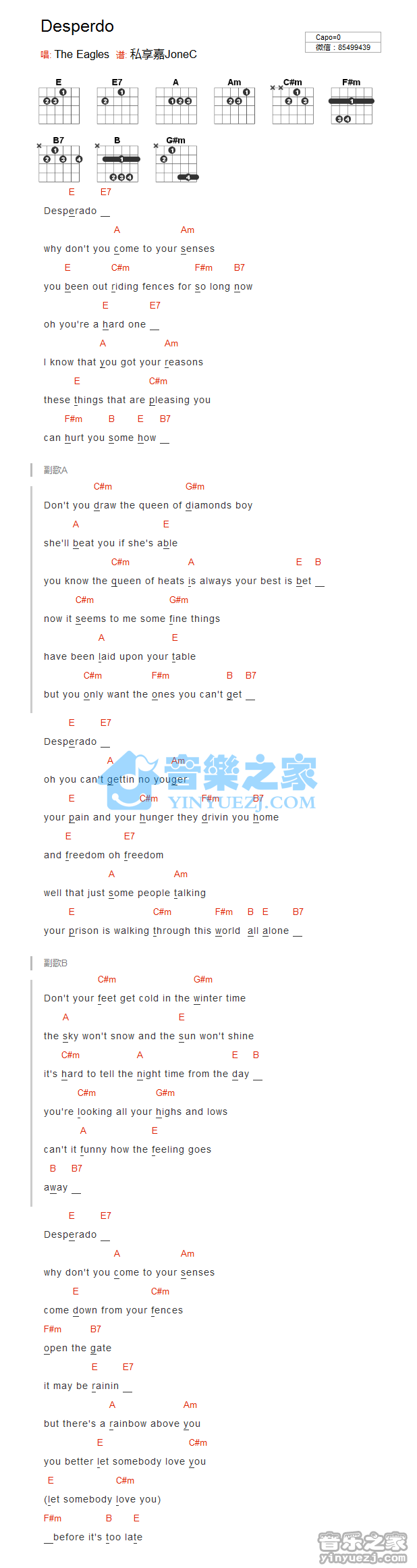 TheEagles《Desperdo》吉他谱,YYZJ编配出品,共有1张高清图谱,免翻页排版设计。...