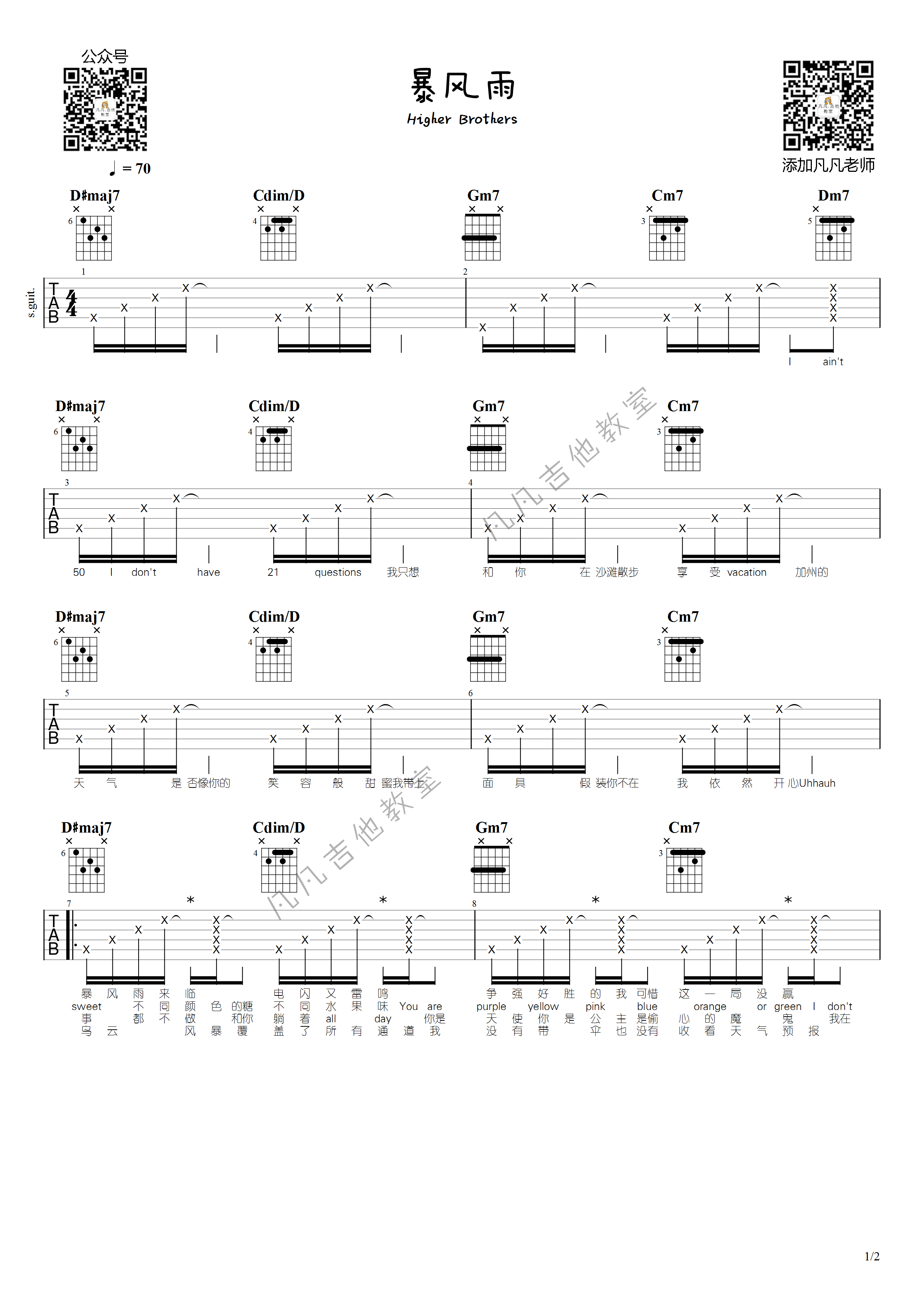 HigherBrothers、HARIKIRI《暴风雨》吉他谱,凡凡老师编配出品,共有2张高清图谱,免翻页排版设计。...
