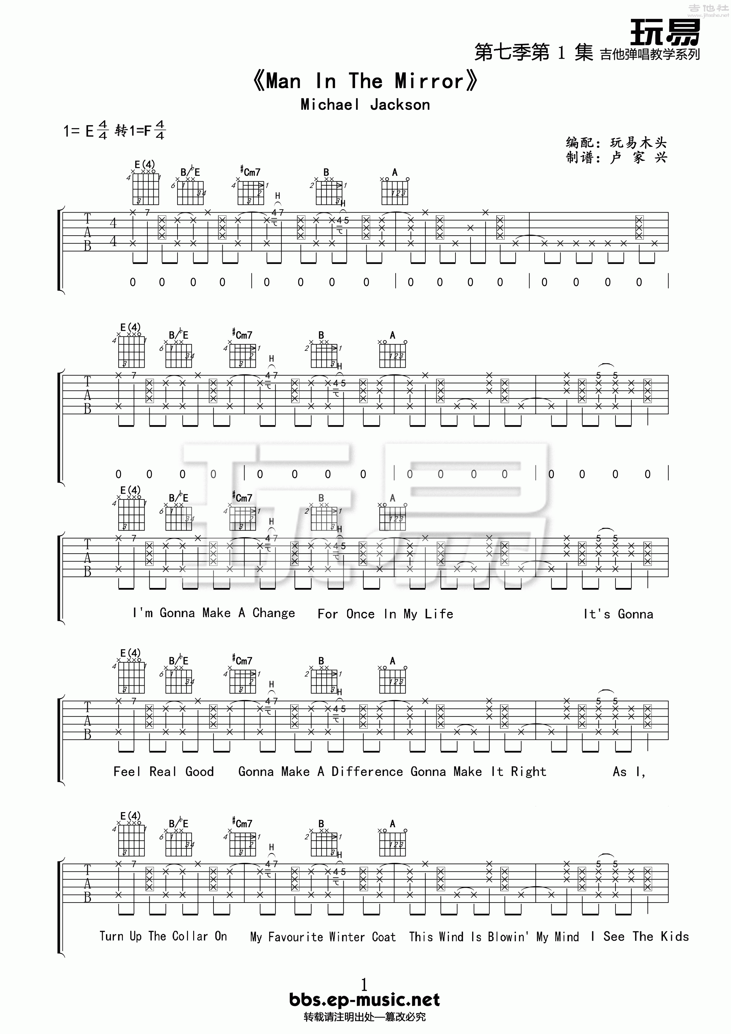 迈克尔·杰克逊《ManInTheMirror》吉他谱,玩易编配出品,共有4张高清图谱。...