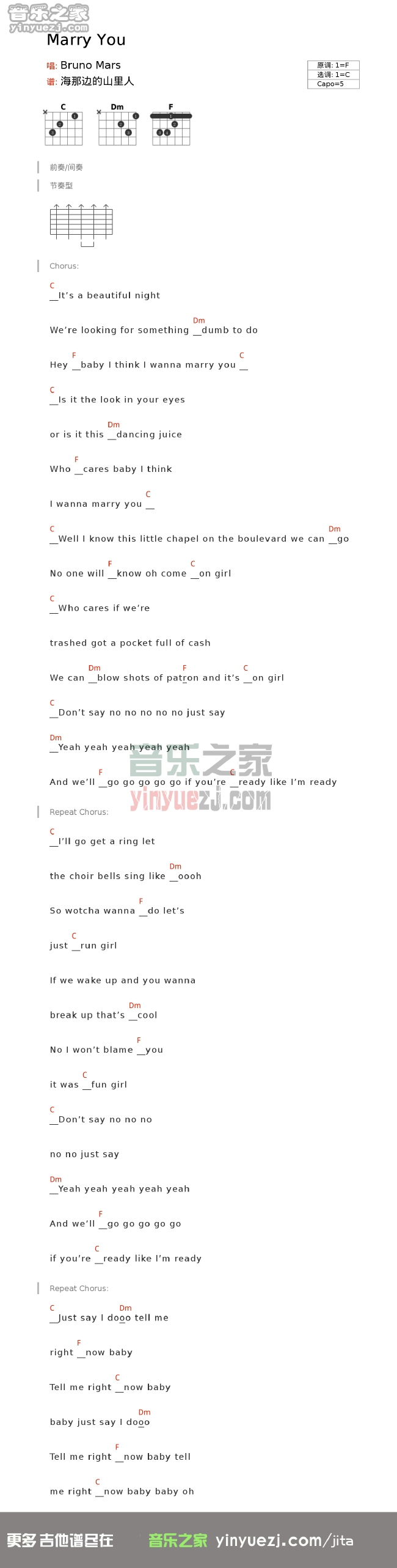 BrunoMars《MarryYou》吉他谱,YYZJ编配出品,共有1张高清图谱,免翻页排版设计。...