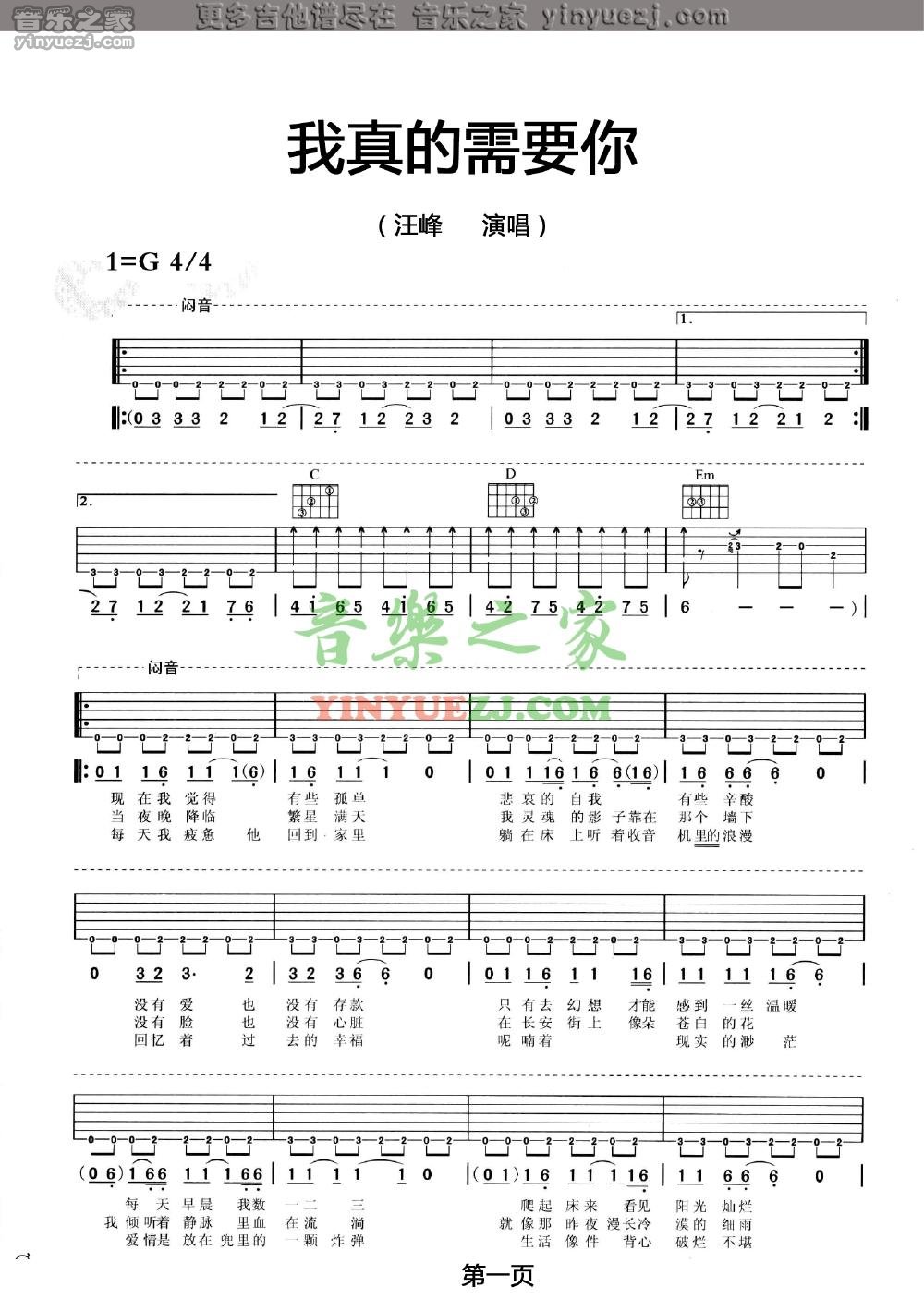 汪峰《我真的需要你》吉他谱,YYZJ编配出品,共有2张高清图谱,免翻页排版设计。...
