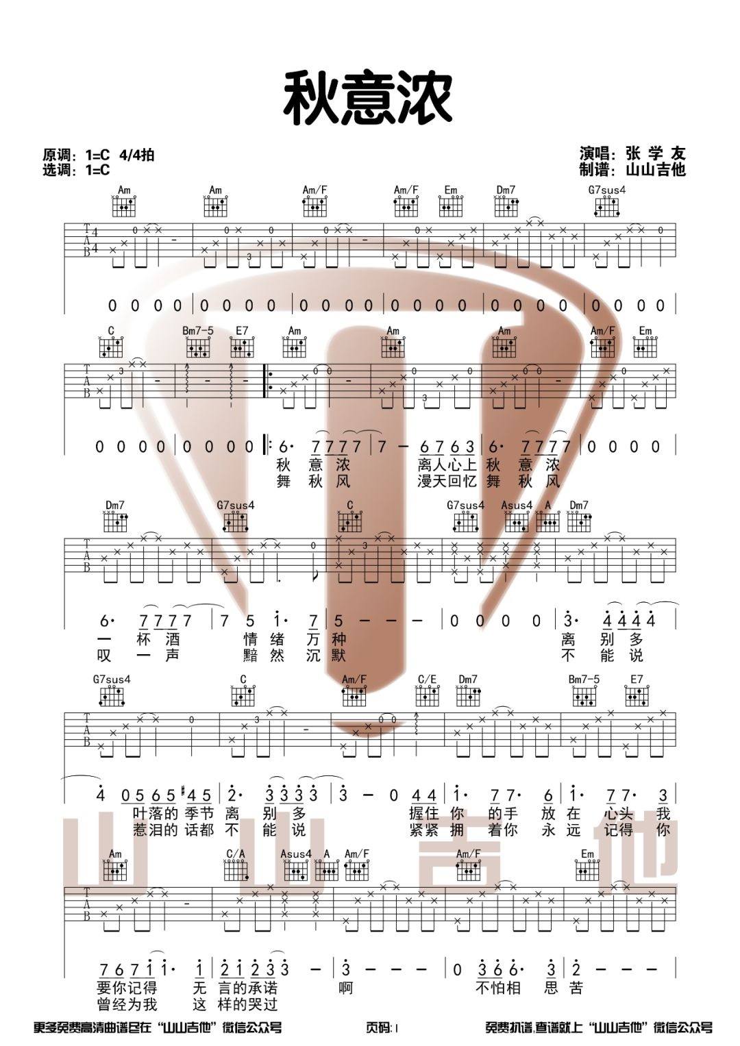 张学友《秋意浓》吉他谱,共有2张高清图谱,免翻页排版设计。...