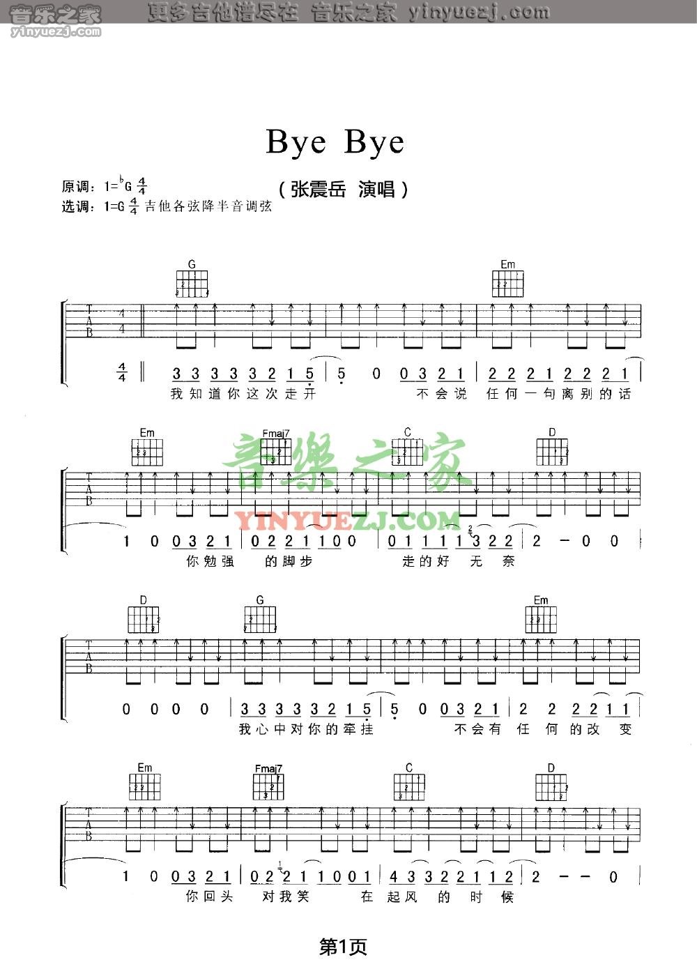 张震岳《byebye》吉他谱,YYZJ编配出品,共有3张高清图谱。...