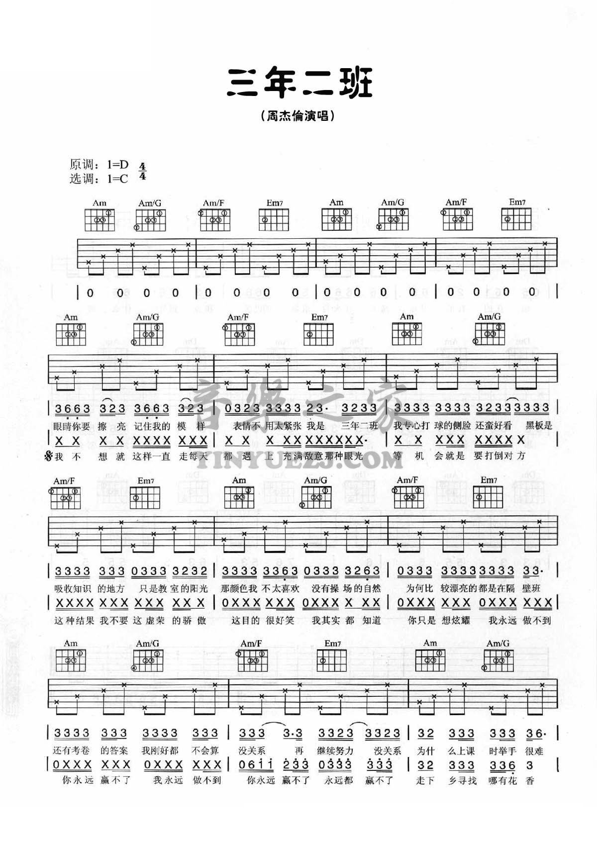 周杰伦《三年二班》吉他谱,YYZJ编配出品,共有2张高清图谱,免翻页排版设计。...