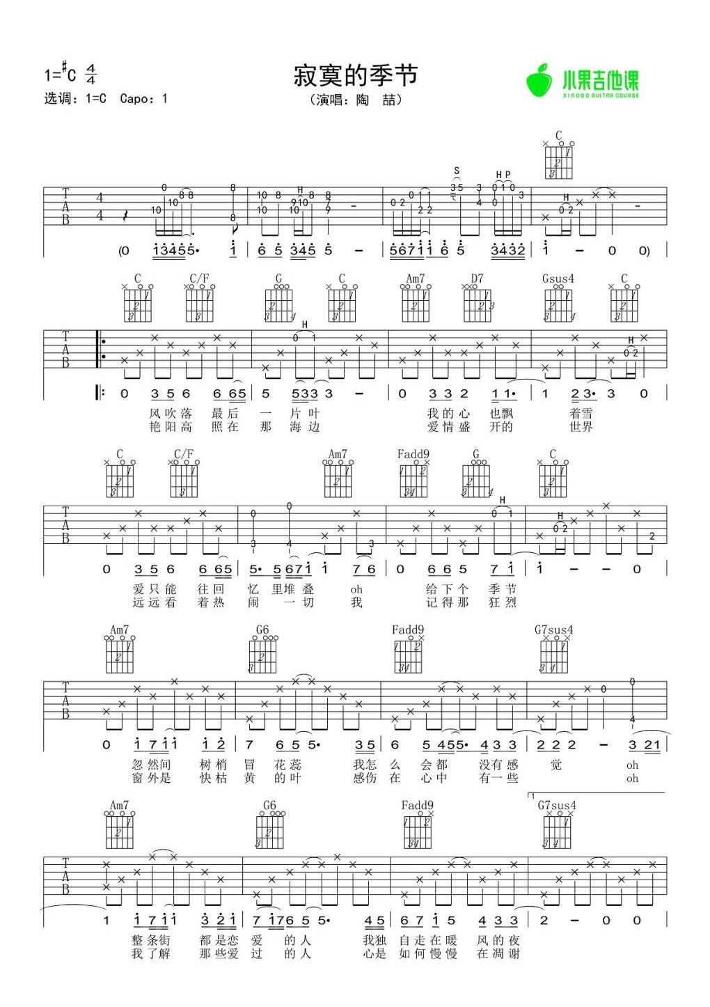 陶喆《寂寞的季节》吉他谱,小果吉他课编配出品,共有3张高清图谱。...